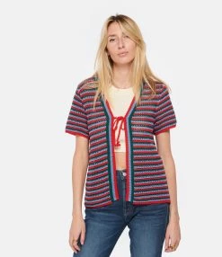 Cardigan à rayures multicolores en coton crocheté. Manches courtes. Fermeture par cordon de serrage sur le devant. Coupe droite. Base droite.