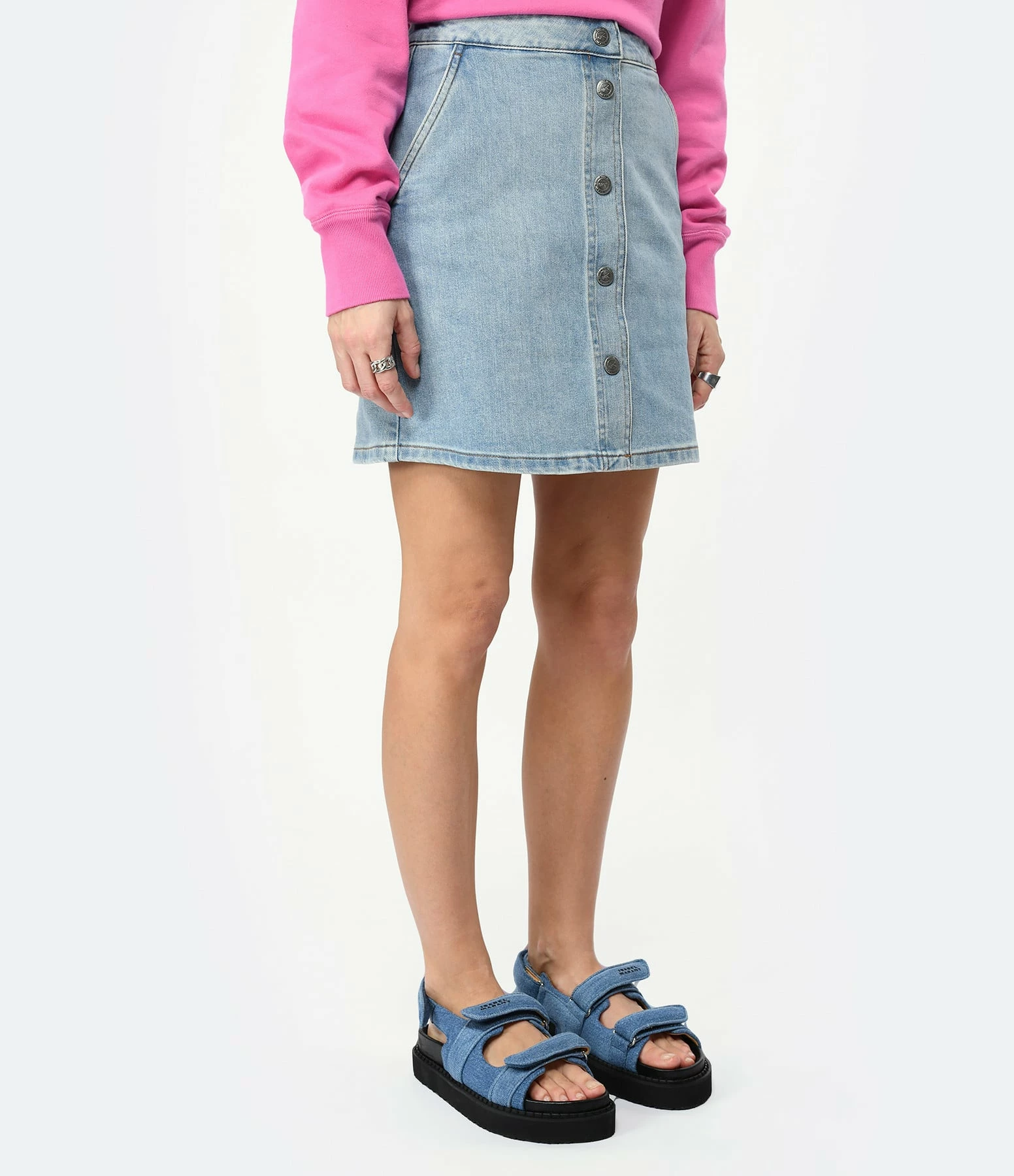 Jupe courte en denim bleu. Deux poches à l’avant et une à l’arrière. Fermeture par boutons. Coupe droite. Base droite.