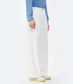 Pantalon en denim blanc. Taille haute avec passants pour ceinture. Fermeture par zip et bouton. Deux poches italiennes à l’avant et une poche passepoilée à l’arrière. Coupe large.