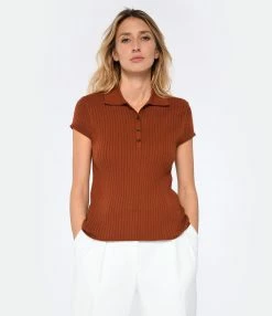 Tee-shirt en maille côtelée de coton marron. Col polo. Manches courtes. Demi-patte de boutonnage sur le devant. Coupe près du corps. Base droite.
