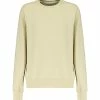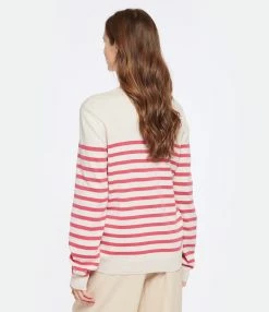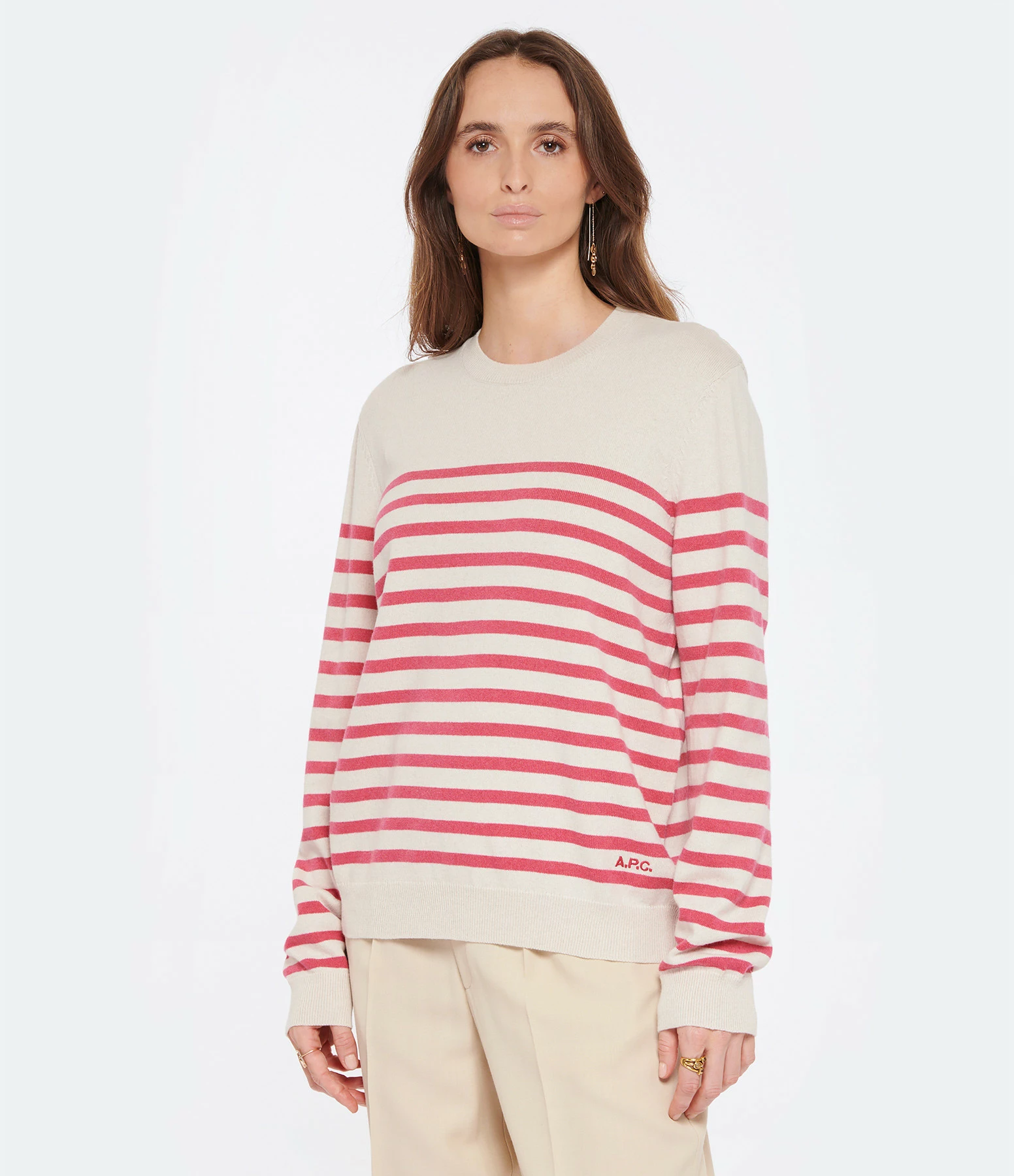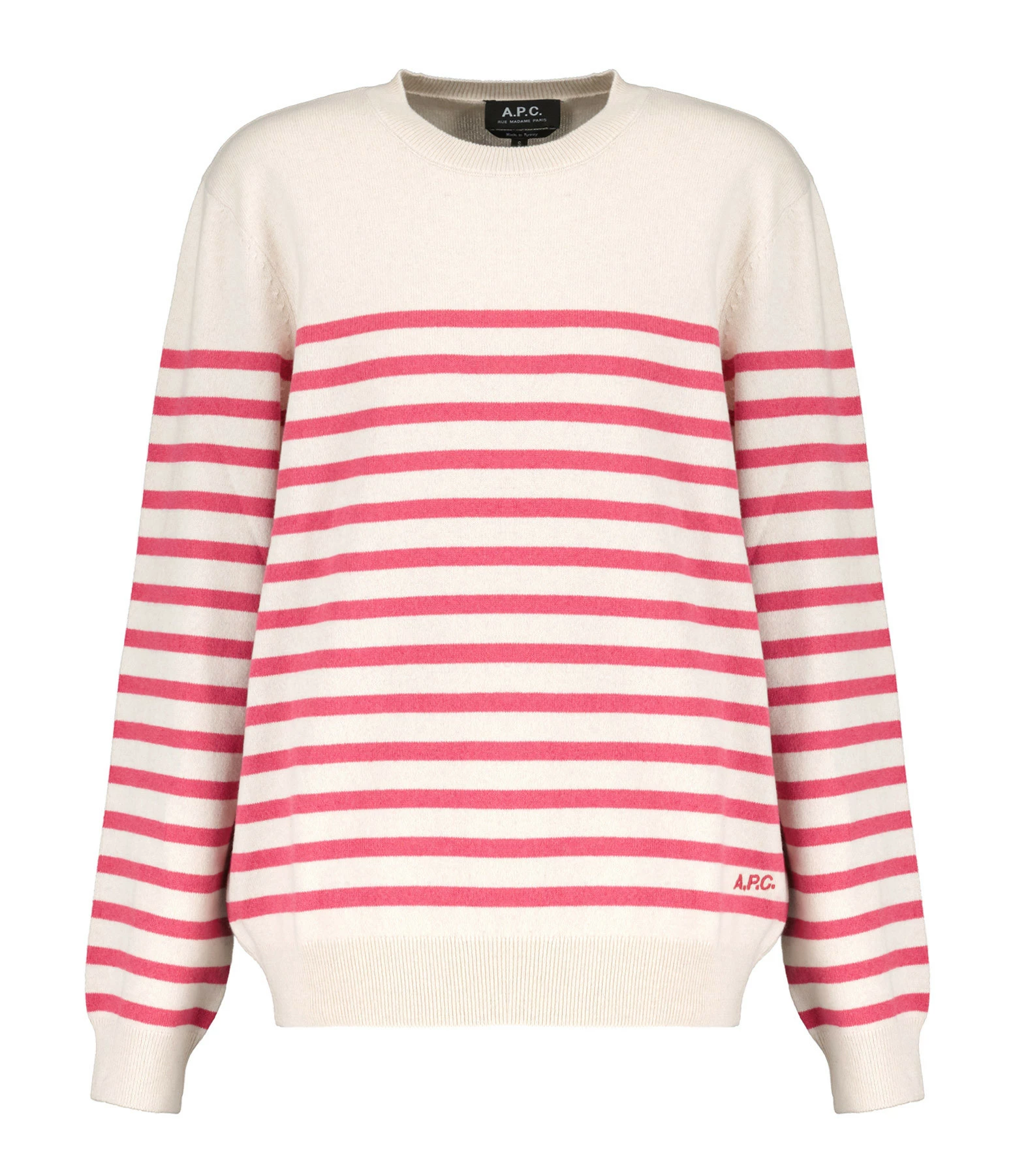 Pull en cachemire à rayures crème et rose. Manches longues. Col rond. Inscription A.P.C brodée en rose en bas à gauche.