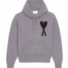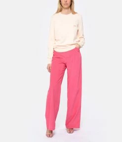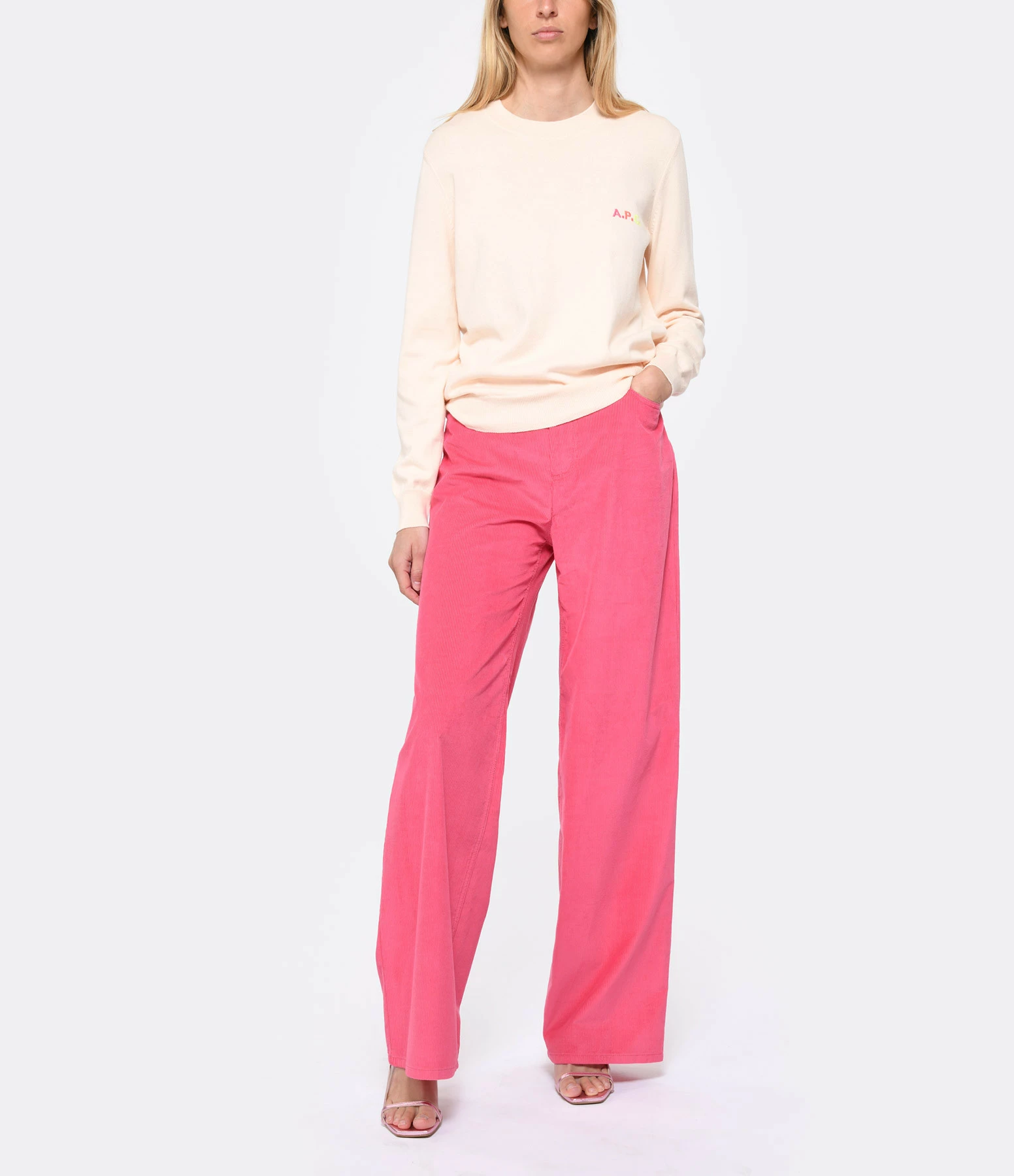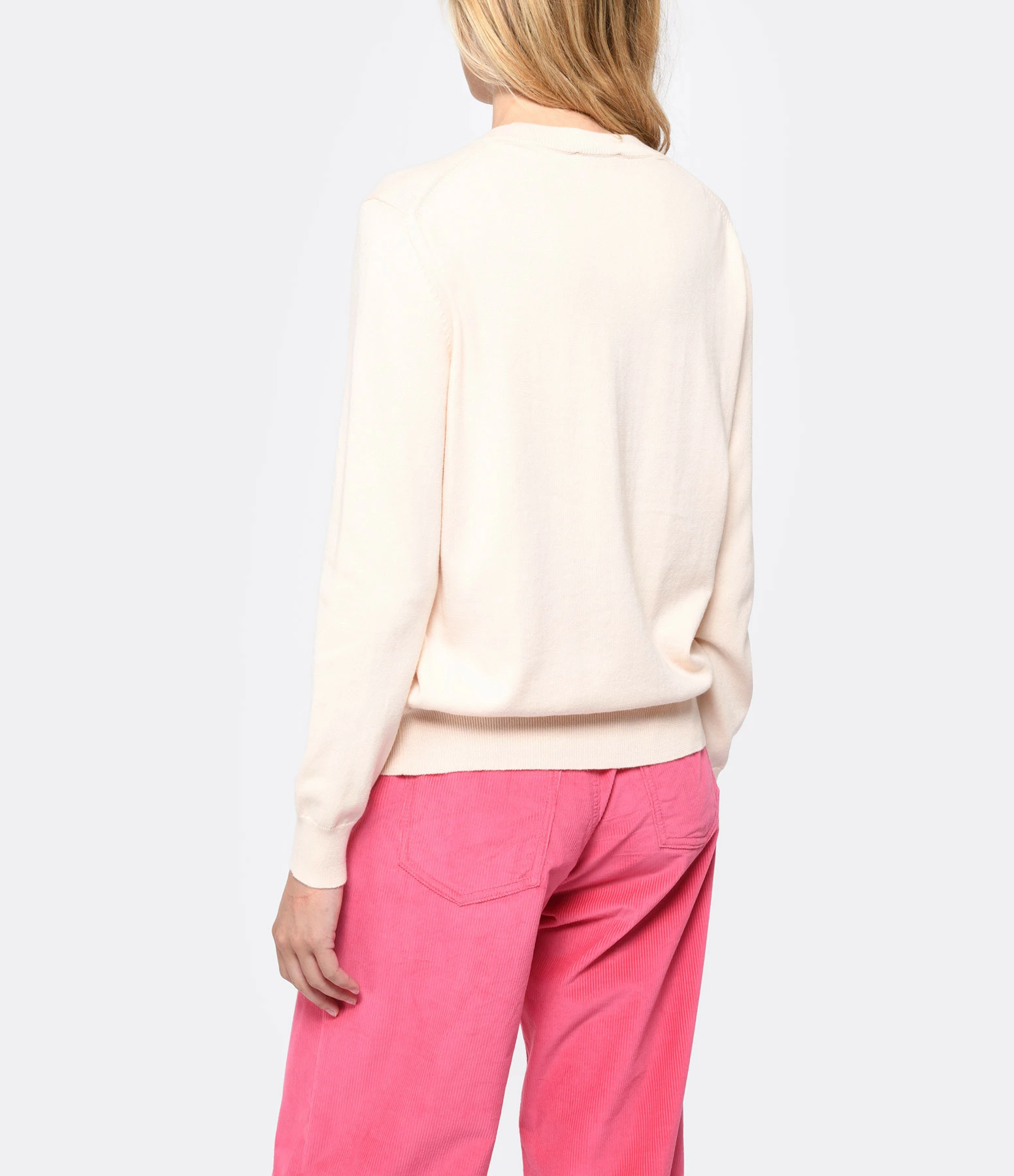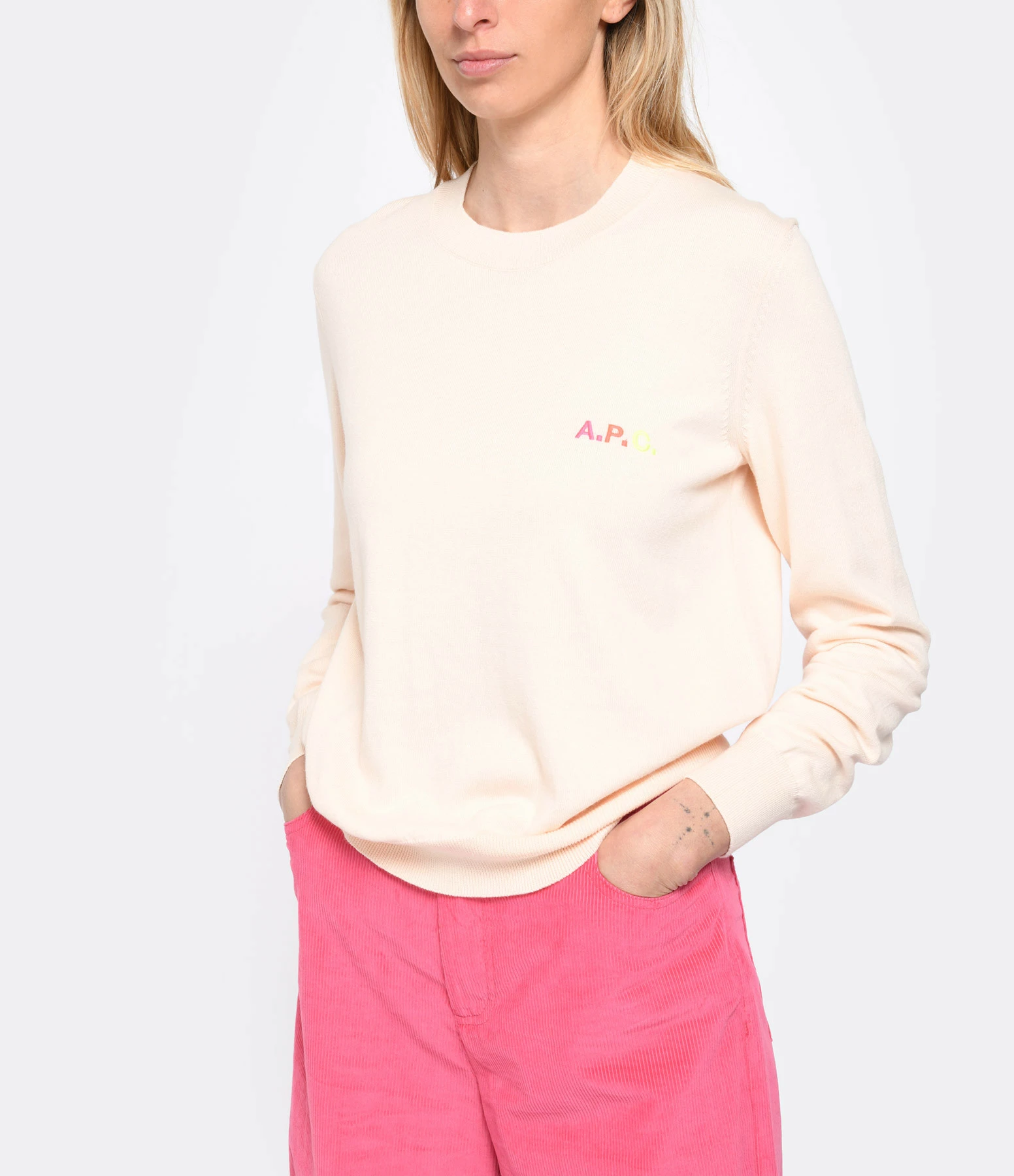 Pull en coton pêche à manches longues. Inscription multicolore “A.P.C.” brodée niveau poitrine. Col rond côtelé. Coupe droite. Base droite.