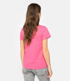Tee-shirt en jersey de coton rose vif avec l’inscription “A.P.C. Rue Madame Paris” brodée en blanc sur la poitrine. Col rond. Manches courtes. Coupe droite. Base droite.