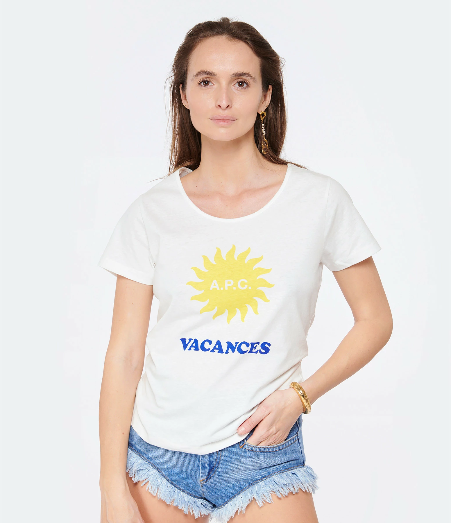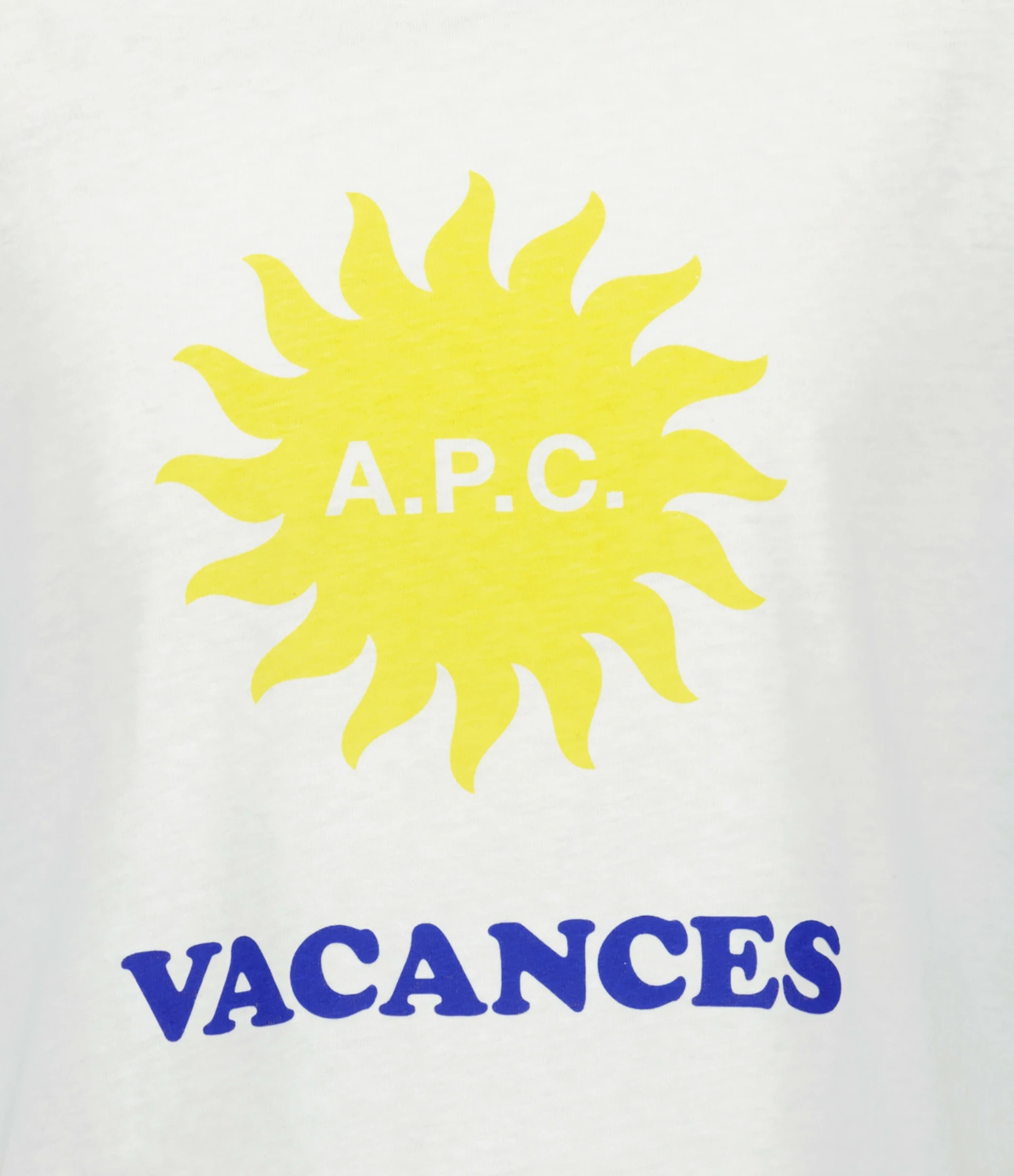 Tee-shirt en coton blanc. Inscription “VACANCES” en bleu et soleil jaune APC sur le devant. Col rond côtelé. Coupe droite. Base droite.
