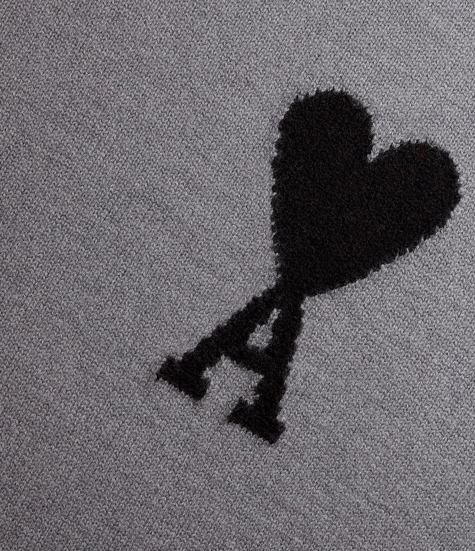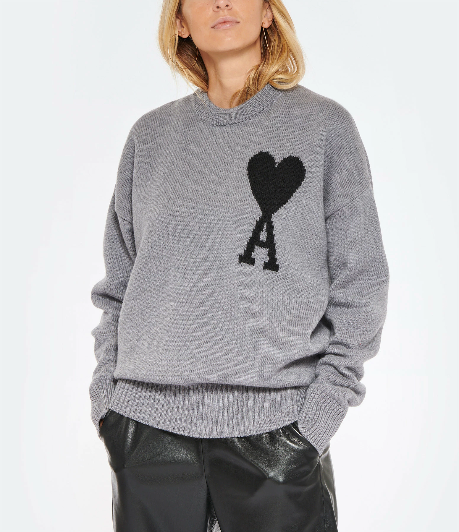 Pull en laine gris avec logo “Ami de cœur” brodé en noir sur la poitrine. Col rond côtelé. Manches longues avec poignets côtelés. Coupe droite ample. Base droite côtelée.