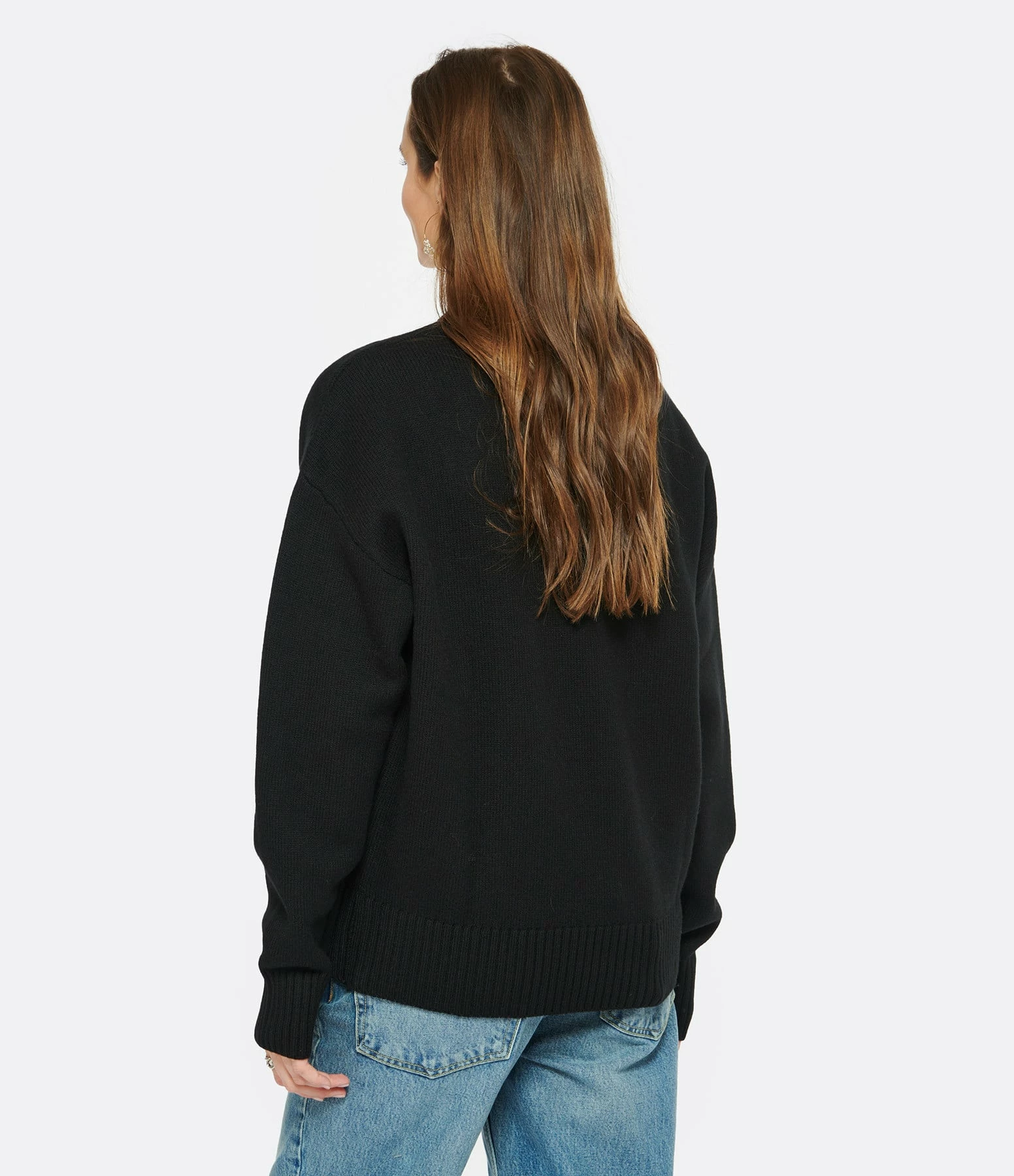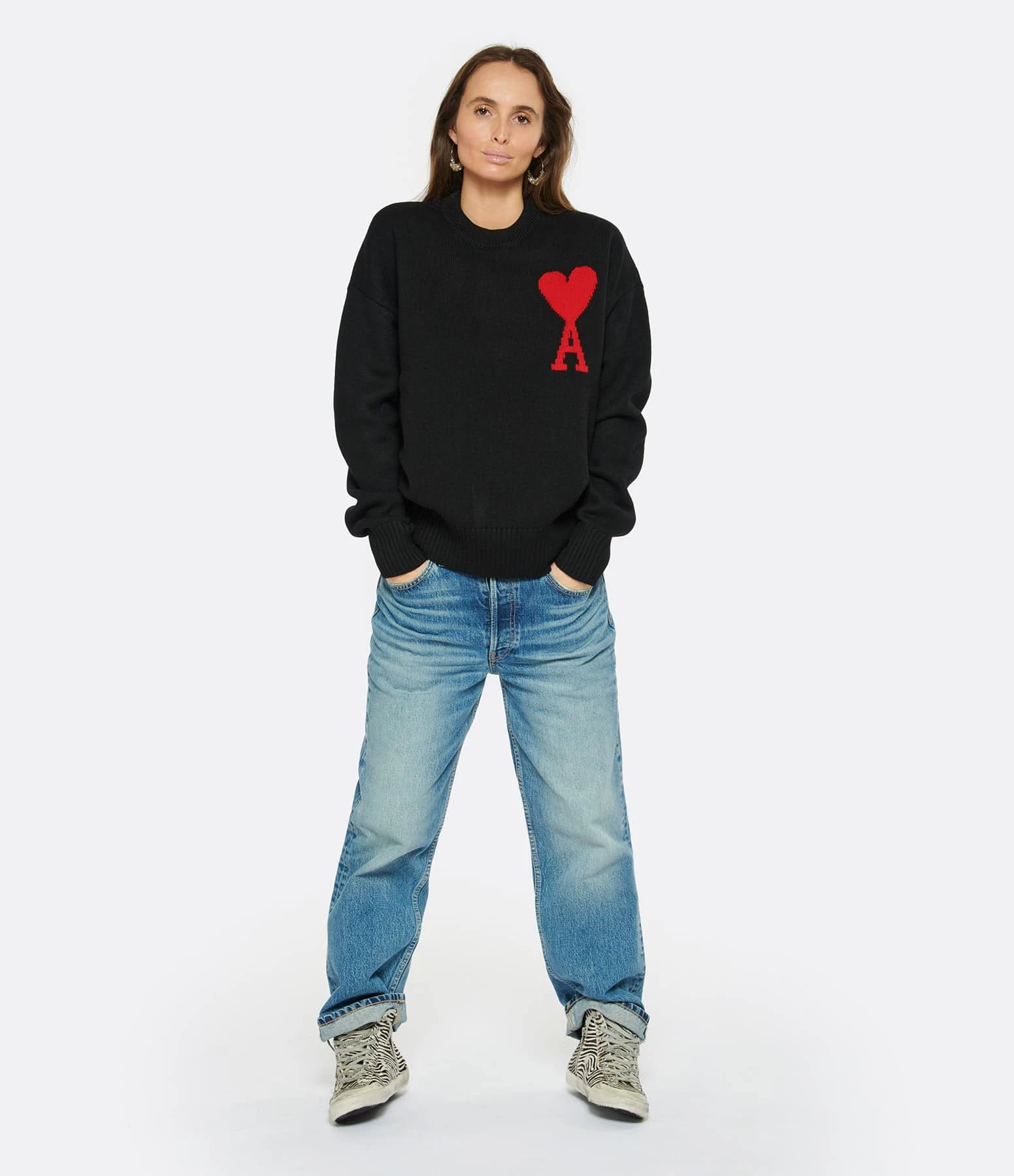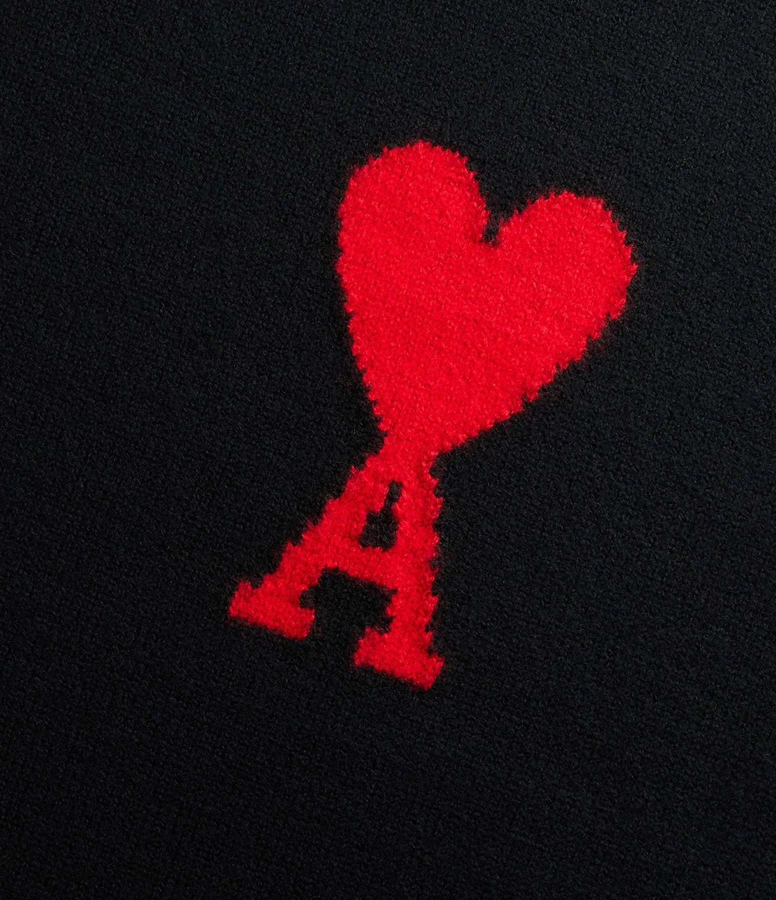 Pull en laine noir avec logo “Ami de cœur” brodé en rouge sur la poitrine. Col rond côtelé. Manches longues avec poignets côtelés. Coupe droite ample. Base droite côtelée.