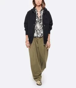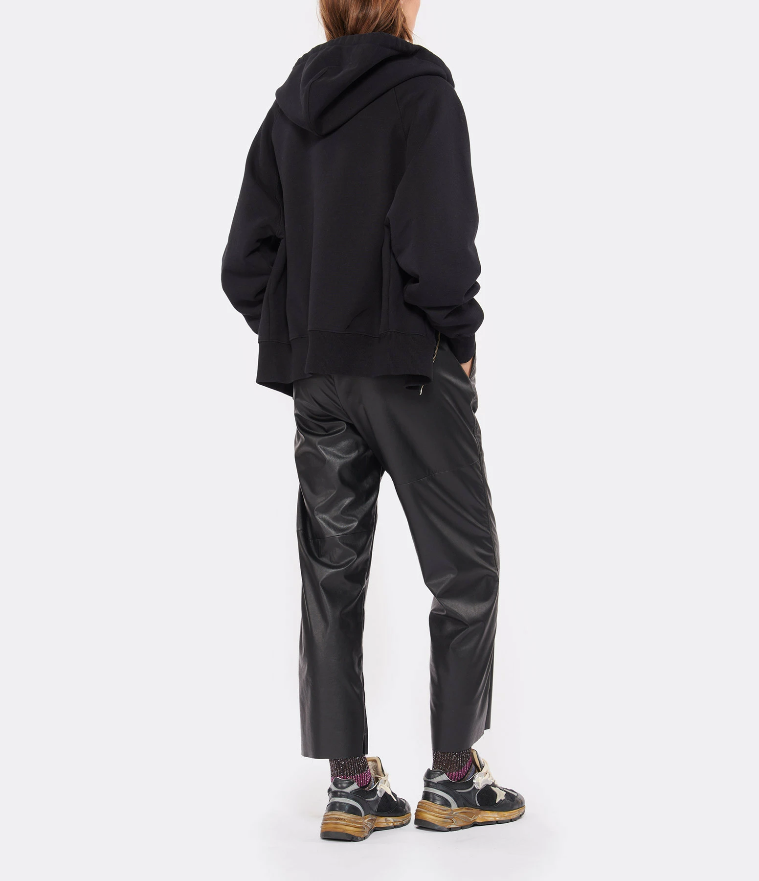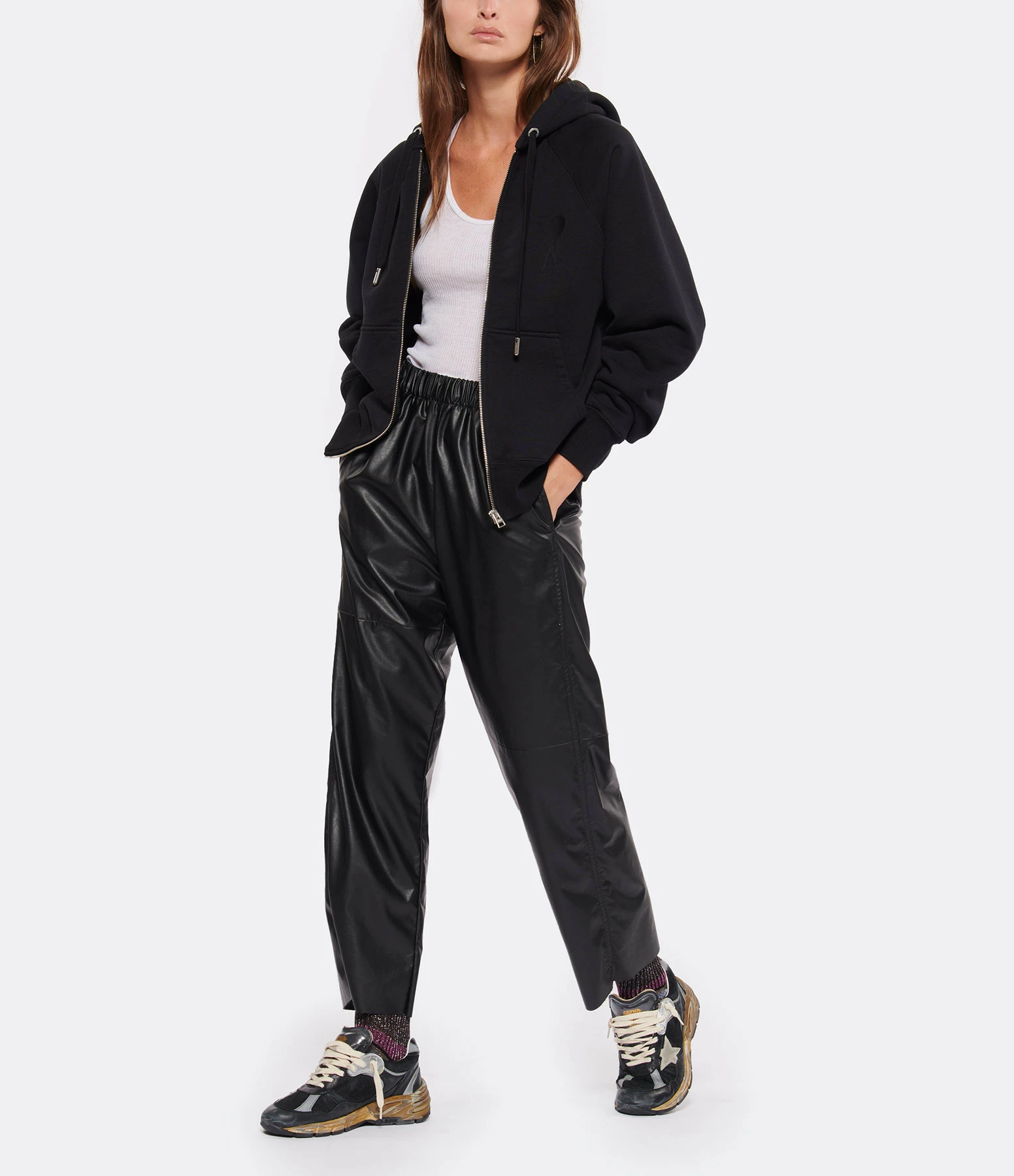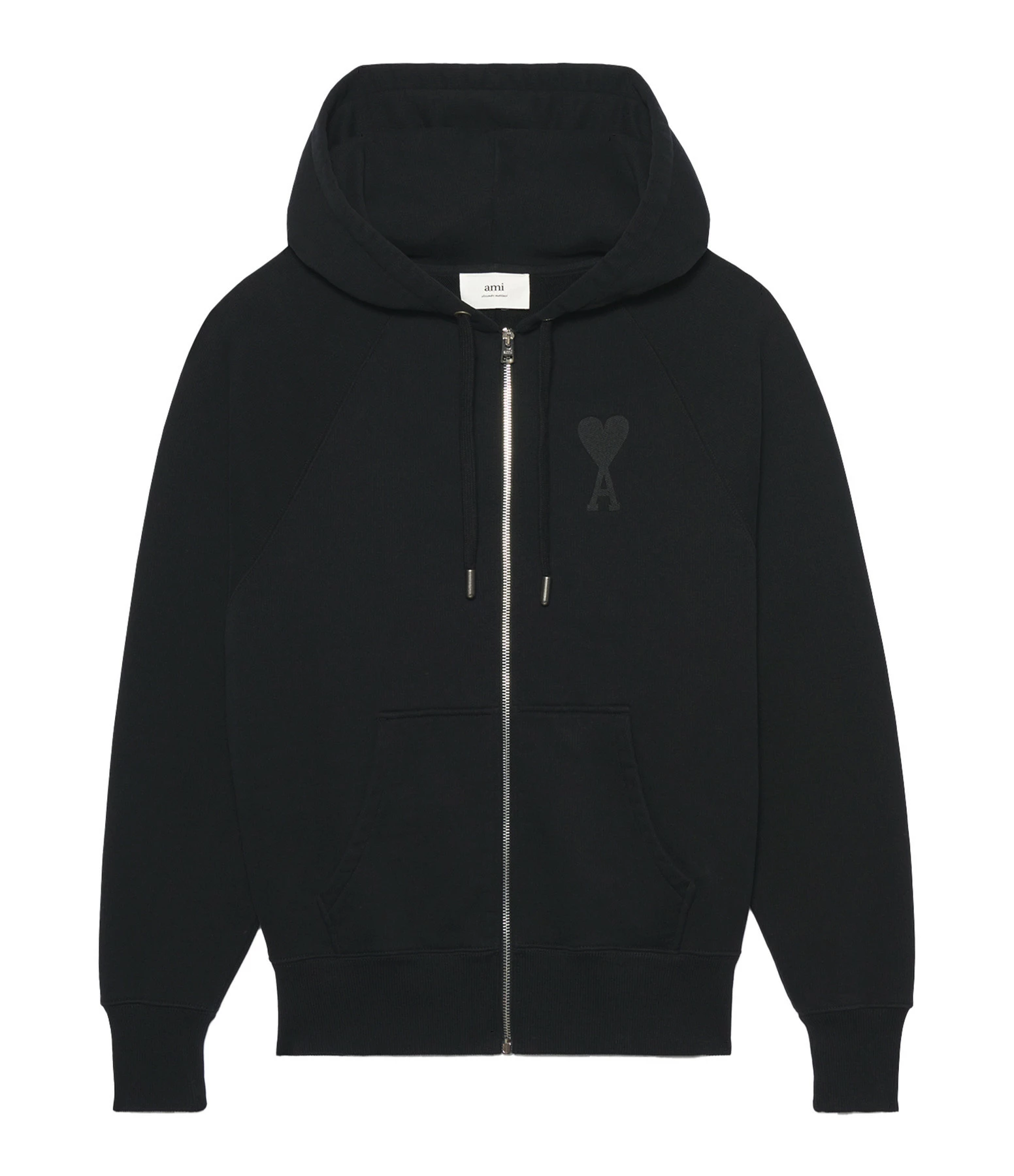 Sweatshirt à capuche en coton noir. Fermeture par zip. Liens de serrage. Broderie ton sur ton côté cœur. Broderie “AMI” ton sur ton sous encolure dos. Manches longues élastiquées. Base droite. Coupe droite.