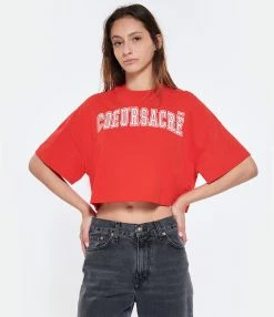 Tee-shirt court en coton rouge avec inscriptions “COEUR SACRÉ” brodée en blanc à l’avant. Col rond côtelé. Manches courtes. Coupe ample. Base droite.