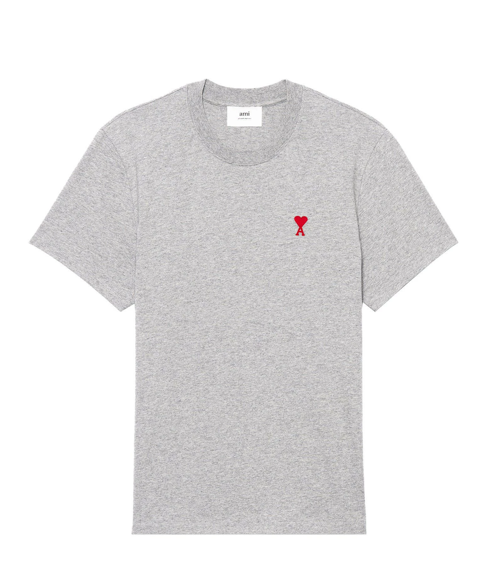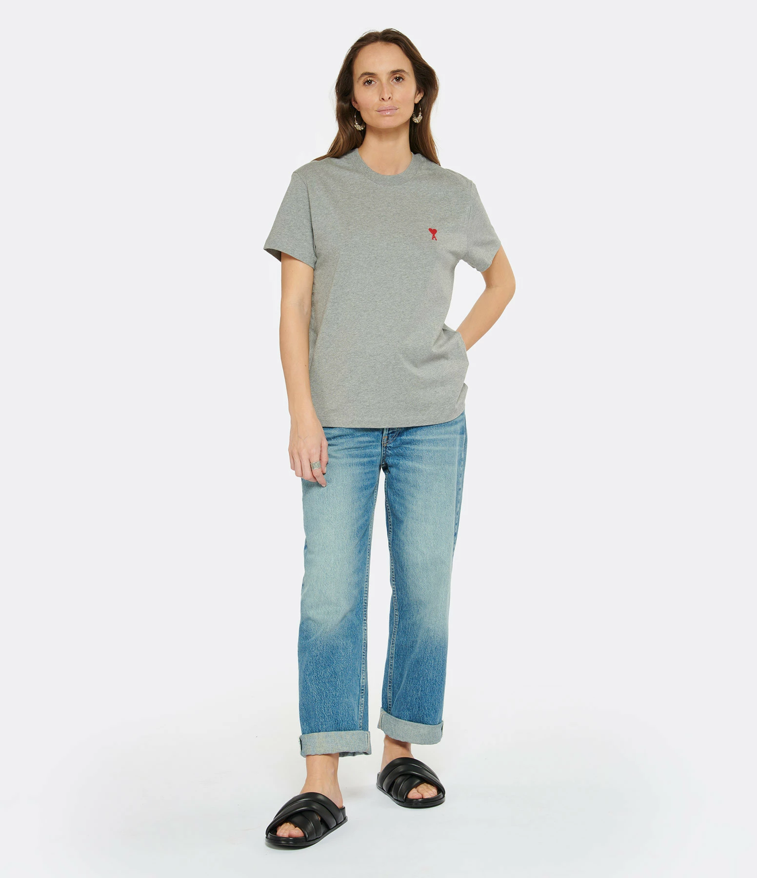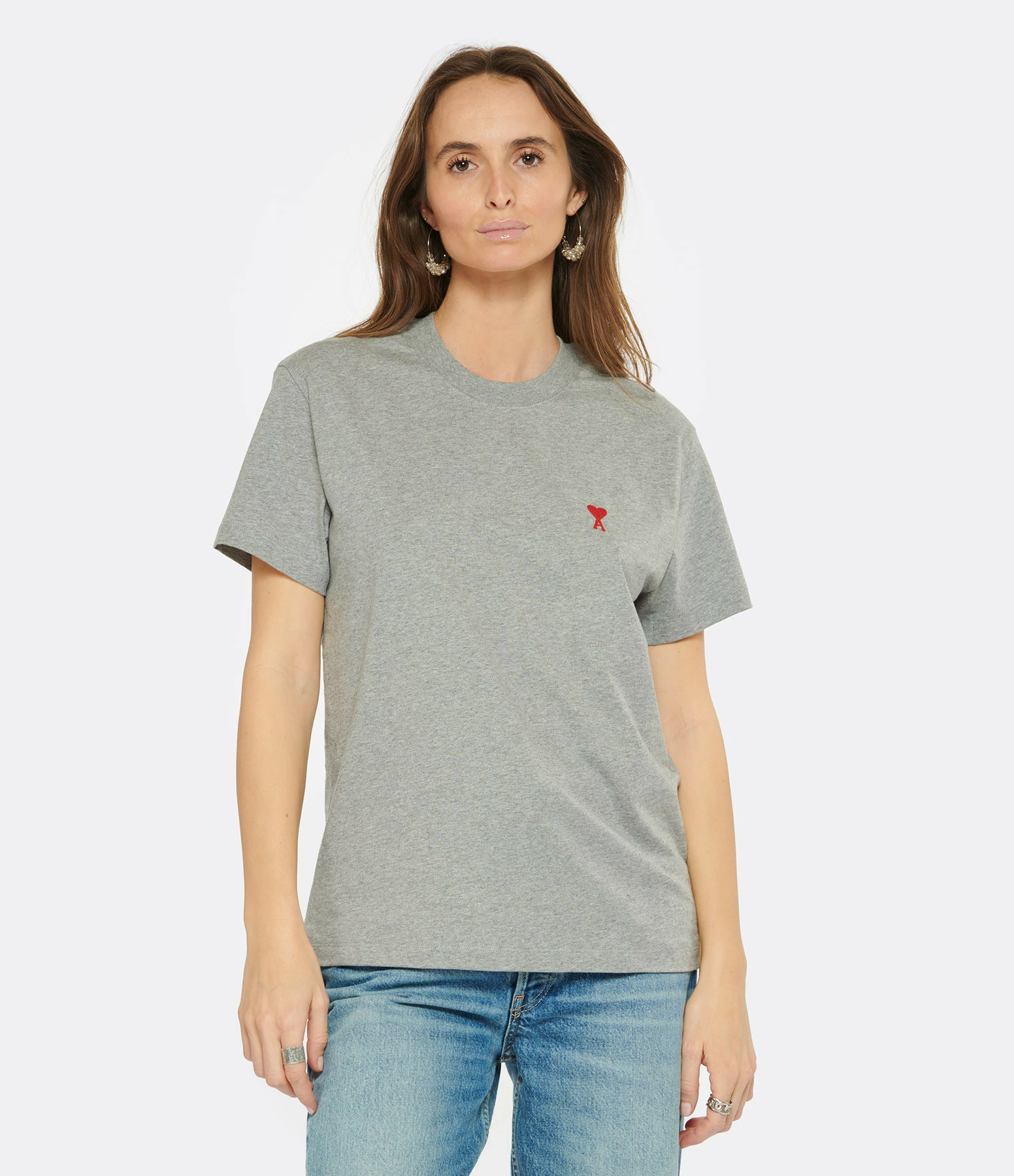 Tee-shirt unisexe en coton gris chiné avec logo rouge “Ami de cœur” brodé sur la poitrine. Col rond côtelé. Manches courtes. Coupe droite. Base droite.