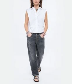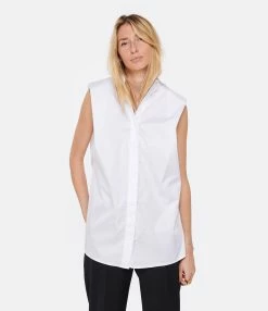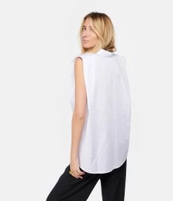 Chemise sans manches à épaulettes en coton blanc. Col chemise. Fermeture boutonnée. Coupe droite. Base arrondie.
