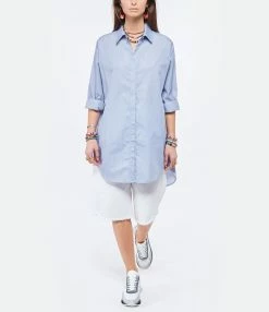 Chemise longue oversize en coton à rayures bleues. Col chemise. Manches longues. Fermeture boutonnée. Coupe ample. Base arrondie, plus longue à l’arrière.