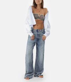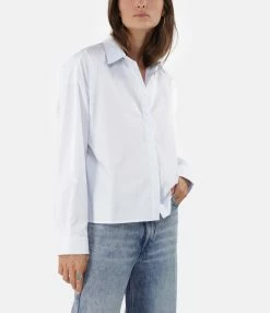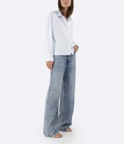 Chemise en coton bleu ciel. Col chemise. Manches longues. Fermeture boutonnée. Coupe droite. Base droite à l’avant et arrondie à l’arrière.