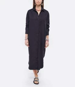 Robe chemise longue en coton noir. Col chemise. Manches longues. Fermeture boutonnée. Une poche passepoilée en biais sur la poitrine. Coupe droite. Base arrondie avec fentes de 27 cm sur les côtés.