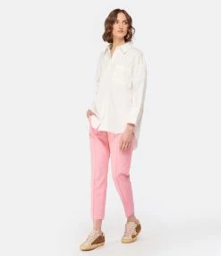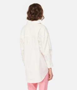 Chemise en coton blanc. Col chemisier. Manches longues avec fentes et poignets boutonnés. Fermeture boutonnée sur le devant. Petits boutons blancs nacrés. Une poche plaquée poitrine. Pli creux dans le dos. Coupe large. Base arrondie.