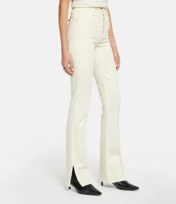Pantalon en denim de coton crème. Cinq poches. Taille haute. Fermeture par boutons. Passants pour ceinture. Coupe droite. Bas de jambe effiloché et fendu.
