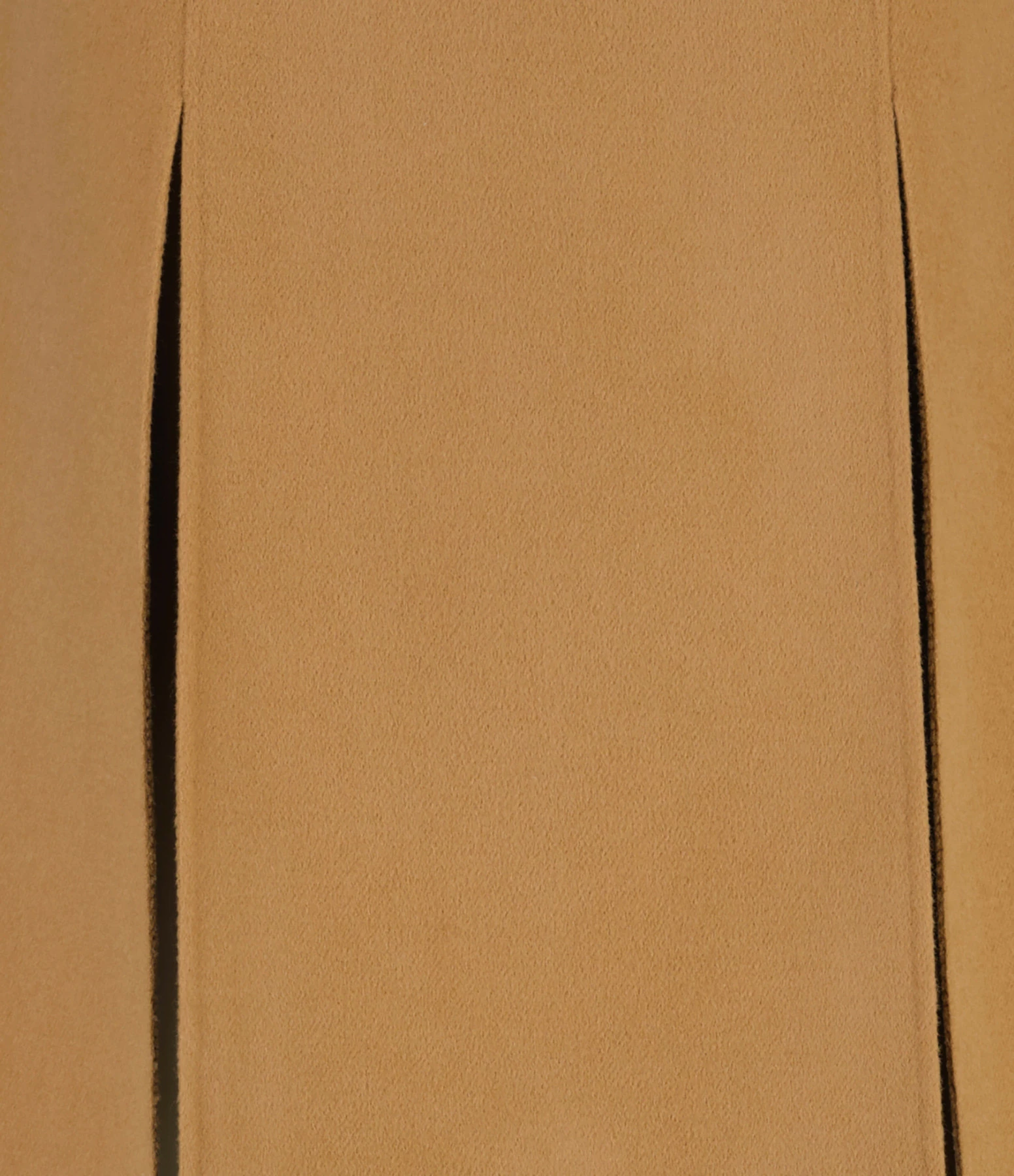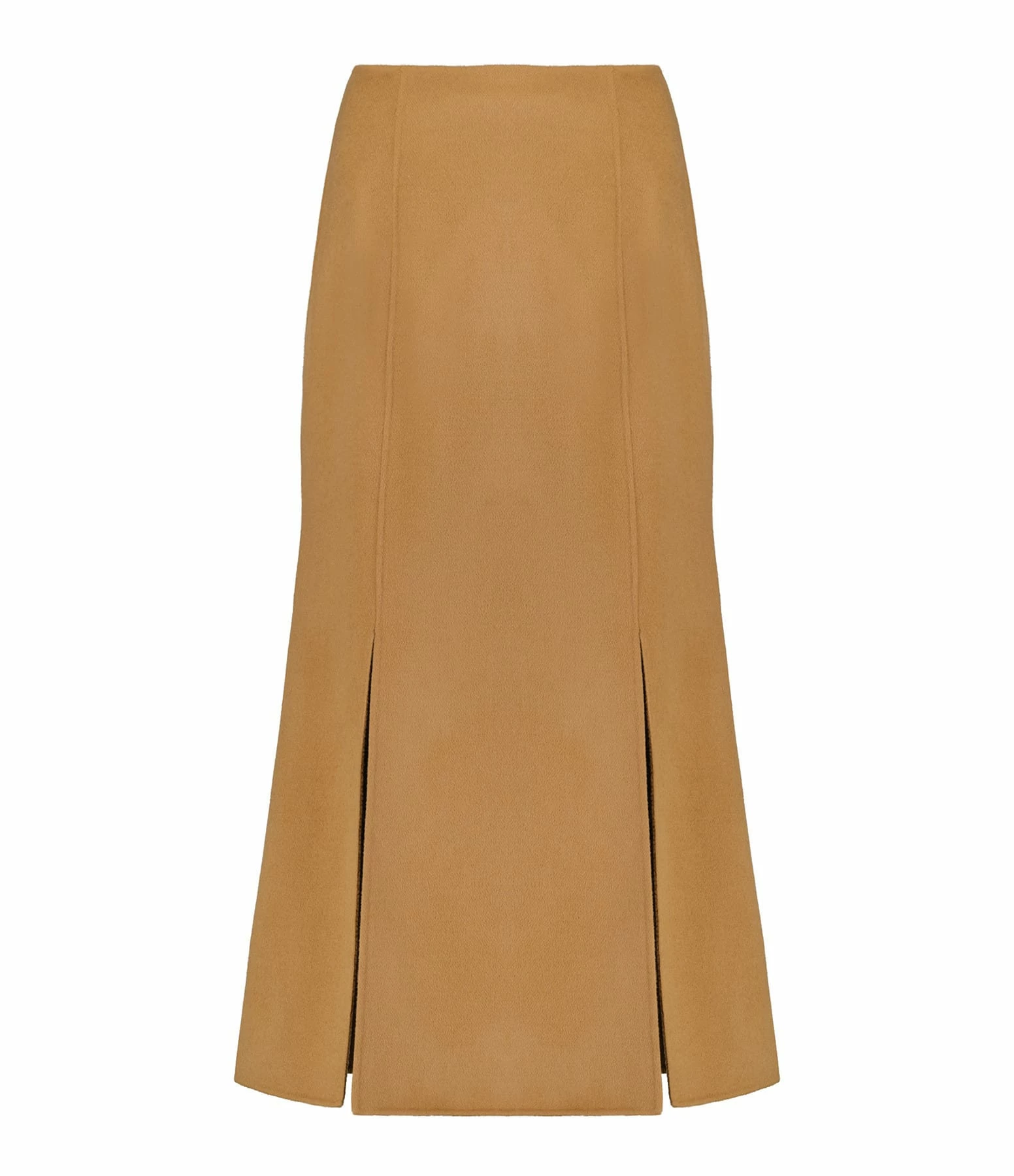 Jupe mi-longue en laine camel. Deux fentes à l’avant. Fermeture par zip à l’arrière. Coupe droite.