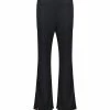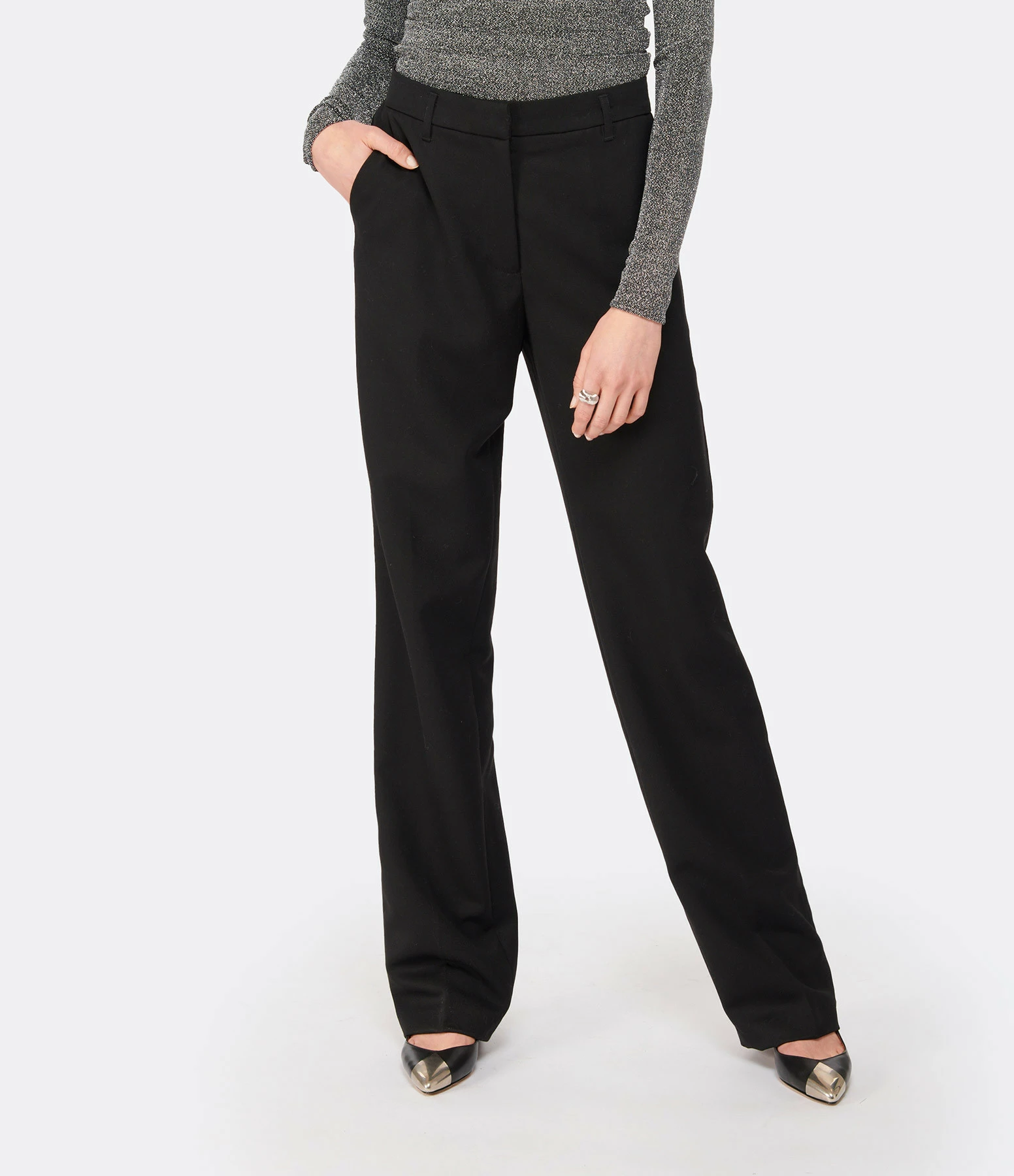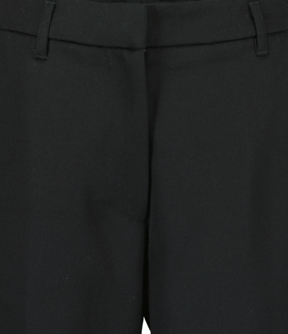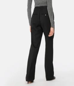 Pantalon tailleur en laine noir. passants pour ceinture. Braguette zippée et crochet. Deux poches italiennes. Deux poches passepoilées boutonnées dans le dos. Boutons noirs. Coupe droite. Base droite.
