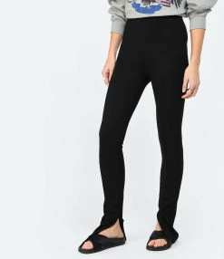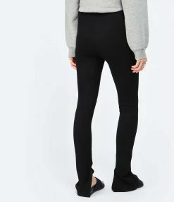 Pantalon tailleur à pinces en tissu stretch noir. Taille haute élastiquée. Fermeture zippée invisible latérale. Coupe slim. Base droite avec fente latérale.