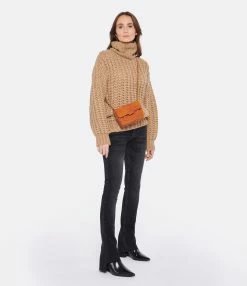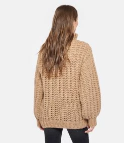 Pull en laine marron chiné. Col roulé. Manches longues. Coupe ample. Base droite.