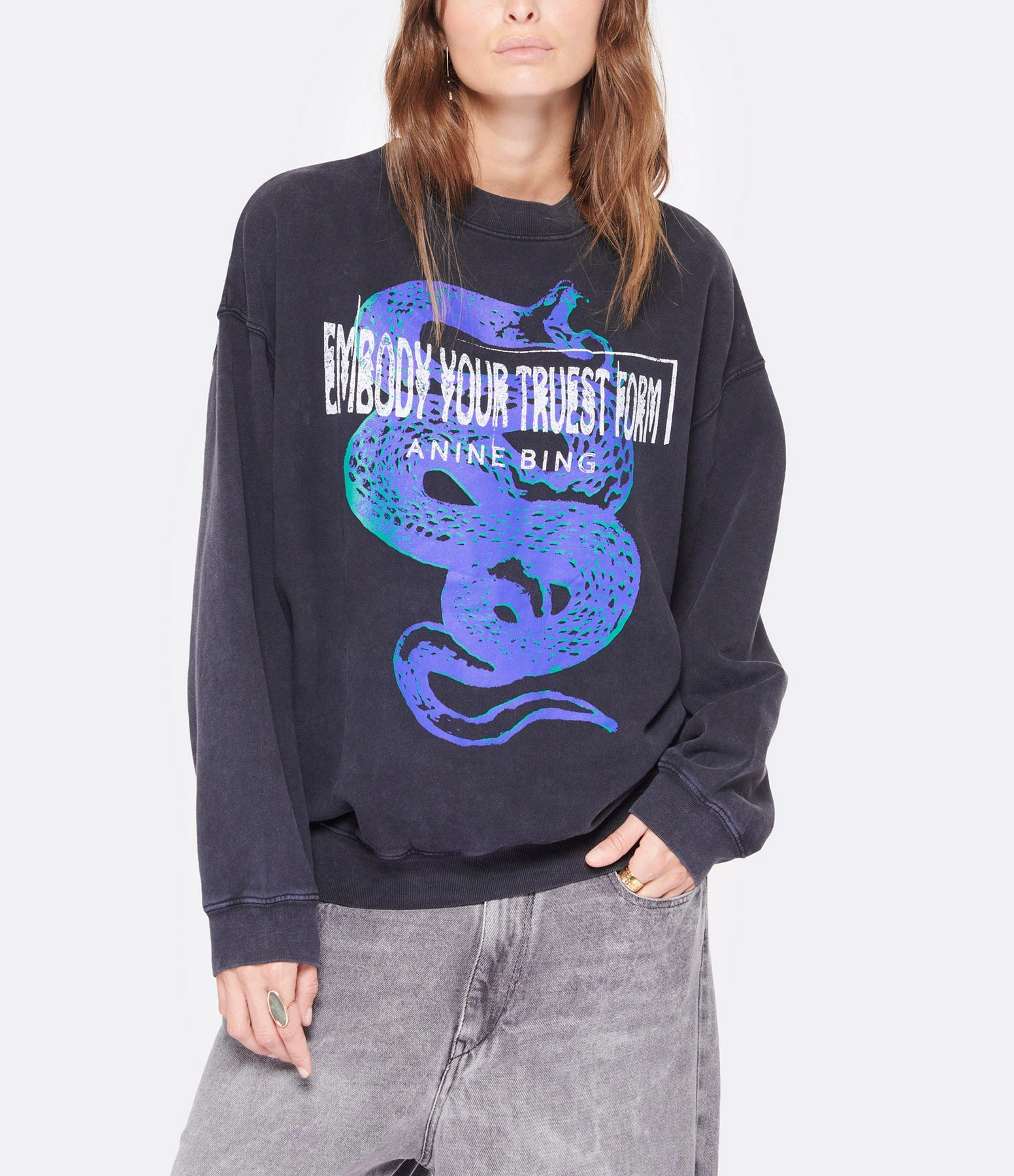 Sweatshirt en coton noir délavé sérigraphié. Col rond. Manches longues. Inscriptions multicolores à l’avant et à l’arrière. Coupe droite. Base droite. Non doublé.