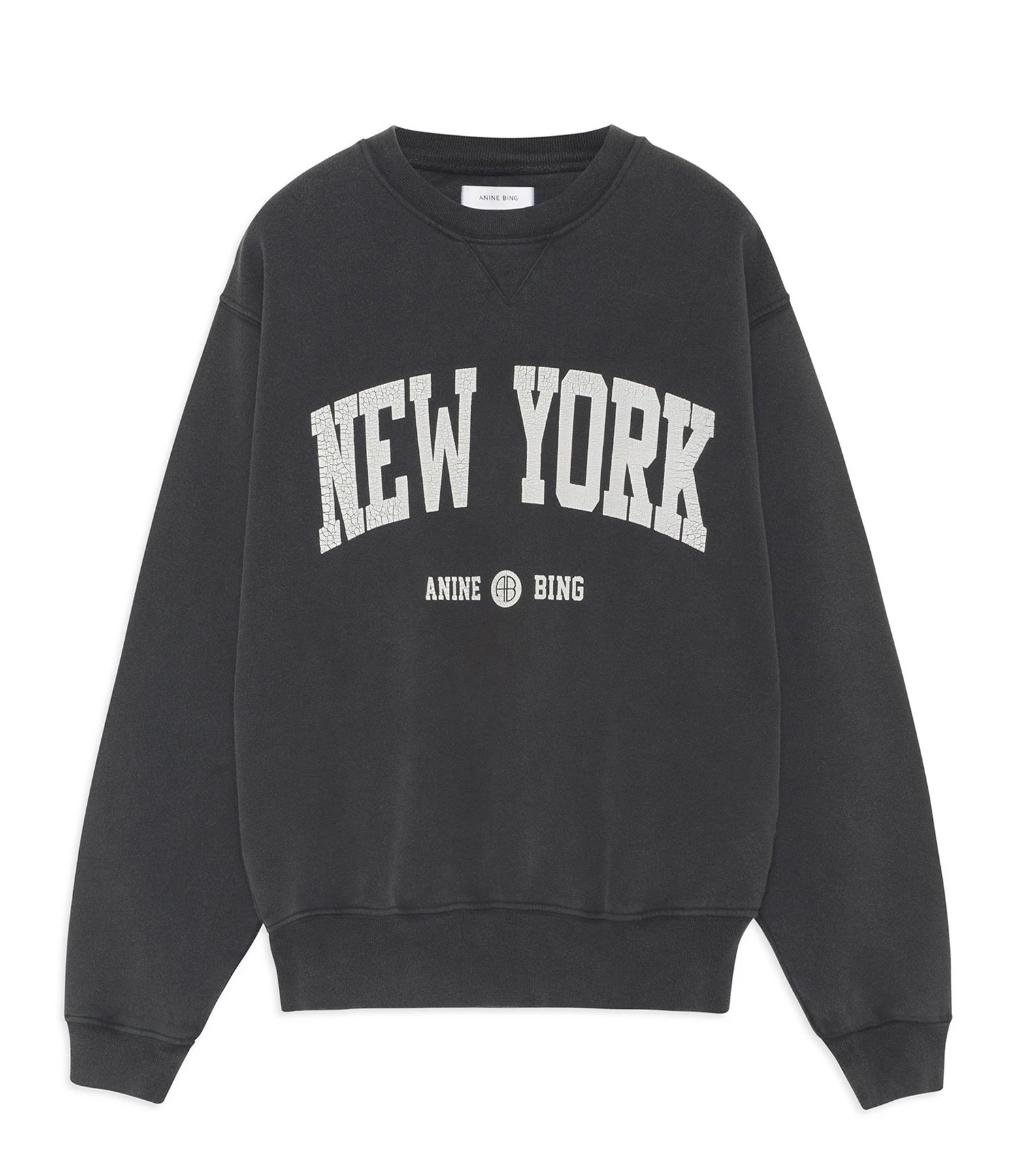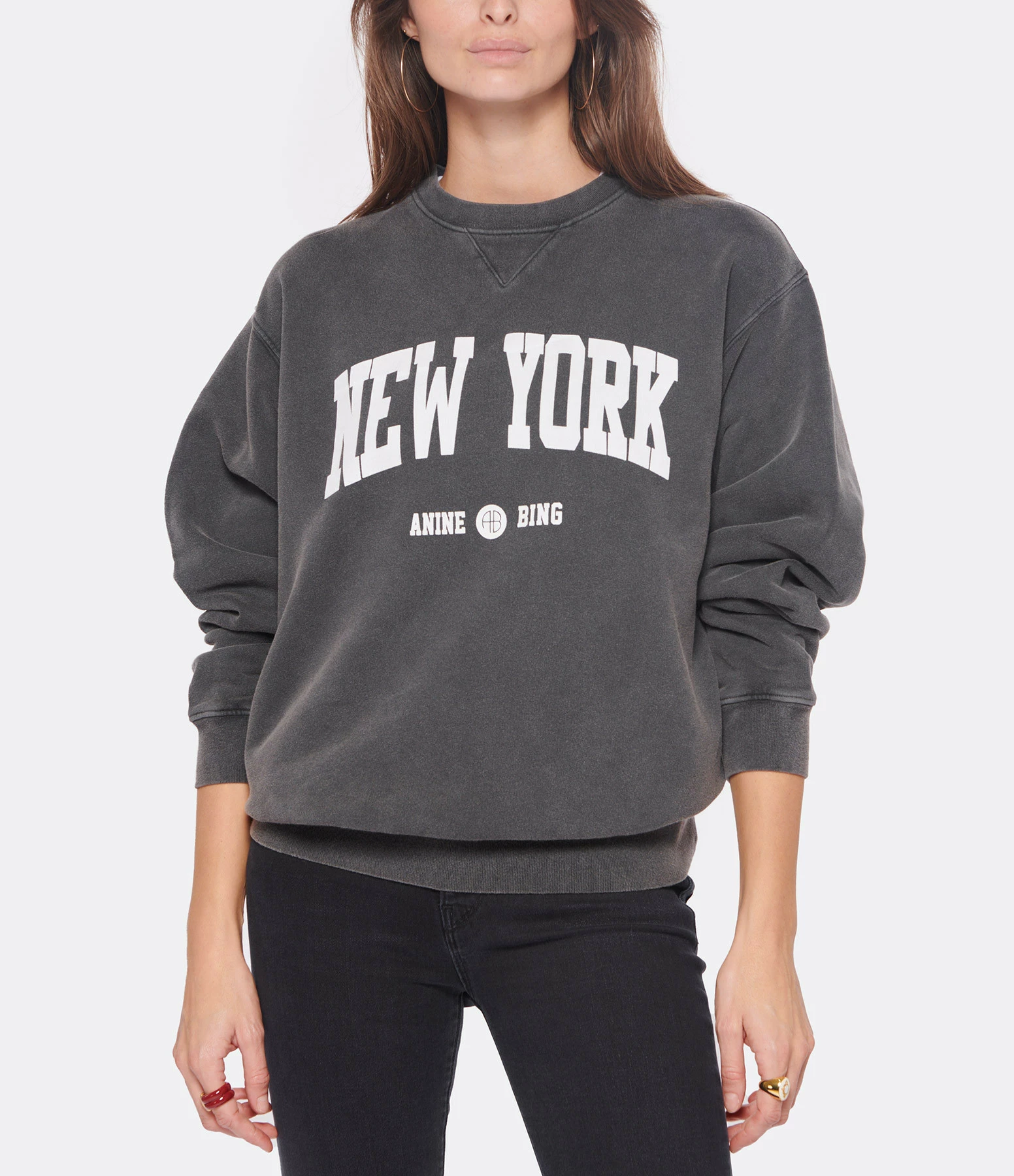 Sweatshirt en coton molletonné noir avec l’inscription “New York Anine Bing” flockée en blanc sur le devant. Col rond côtelé. Manches longues avec poignets côtelés. Coupe oversized. Base droite côtelée.