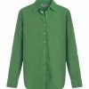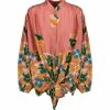 Blouse à fleur dans les tons rouge. Col rond avec cordons de serrage. Manches longues bouffantes resserrées aux poignets avec lien de serrage. Coupe évasée. Base droite.