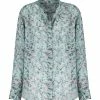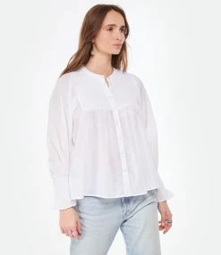 Chemise en coton blanc à manches longues. Col rond. Fermeture par boutons sur le devant. Manches longues bouffantes élastiquées aux poignets. Coupe évasée. Base droite.