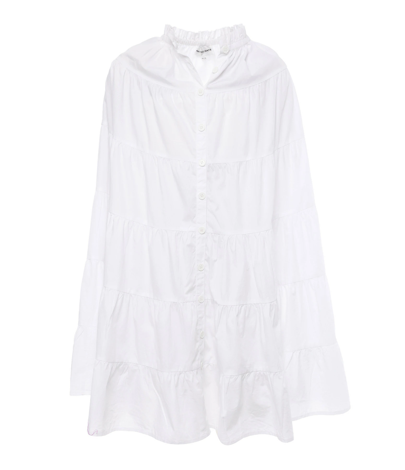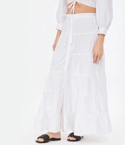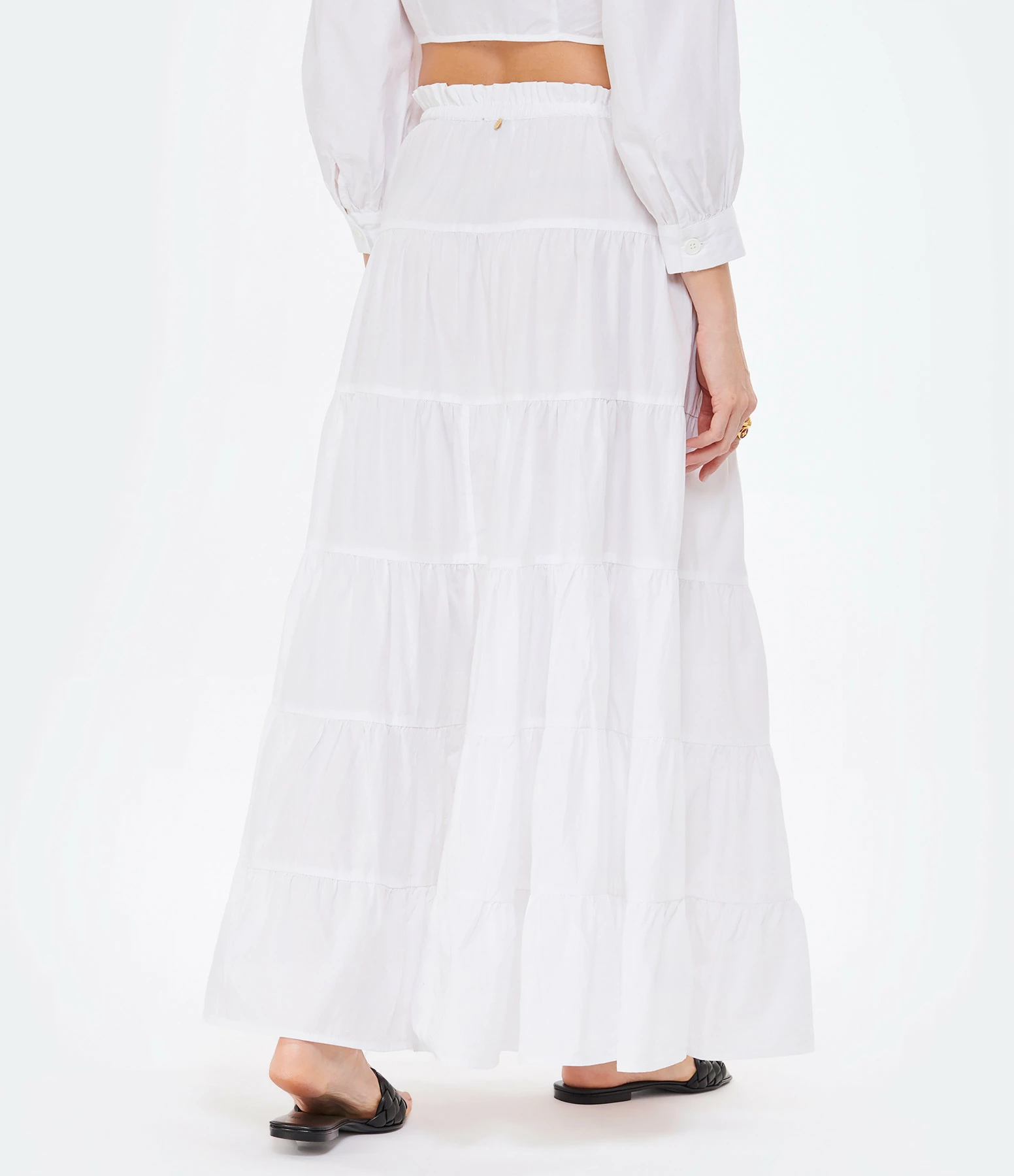 Jupe longue évasée blanche. Fermeture bar bouton blanc sur le devant. Plissée à la taille et sur plusieurs niveaux de la jupe. Coupe évasée. Base droite.
