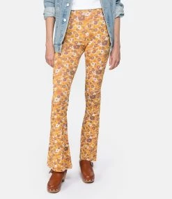 Pantalon effet legging patte d’éléphant à imprimé fleuri dans les tons jaunes. Taille élastiquée. Coupe moulante puis évasé. Base droite.