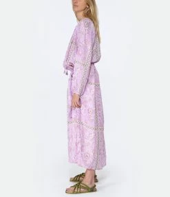 Robe longue en coton à imprimé fleuri dans les tons mauve. Manches longues avec liens de serrage aux poignets. Col en V avec liens de serrage. Ceinture en corde mauve à la taille. Coupe ample. Base droite. Fond de robe inclus.