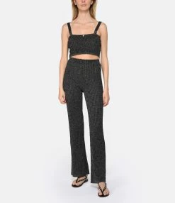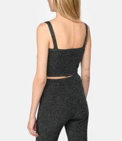 Top court noir à fils argentés. Bretelles fines. Coquillage sur le devant. Coupe droite. Base droite.