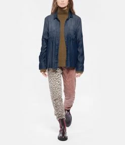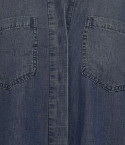 Chemise effet denim. Col chemise décolleté. Manches longues. Deux poches poitrine plaquées. Base arrondie, plus longue à l’arrière avec fente de 24 cm.