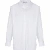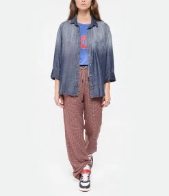 Chemise en denim bleu foncé. Col chemise. Manches 3/4. Une poche plaquée à l’avant. Fermeture par boutons. Plus courte à l’avant. Coupe droite. Base arrondie. Non doublée.