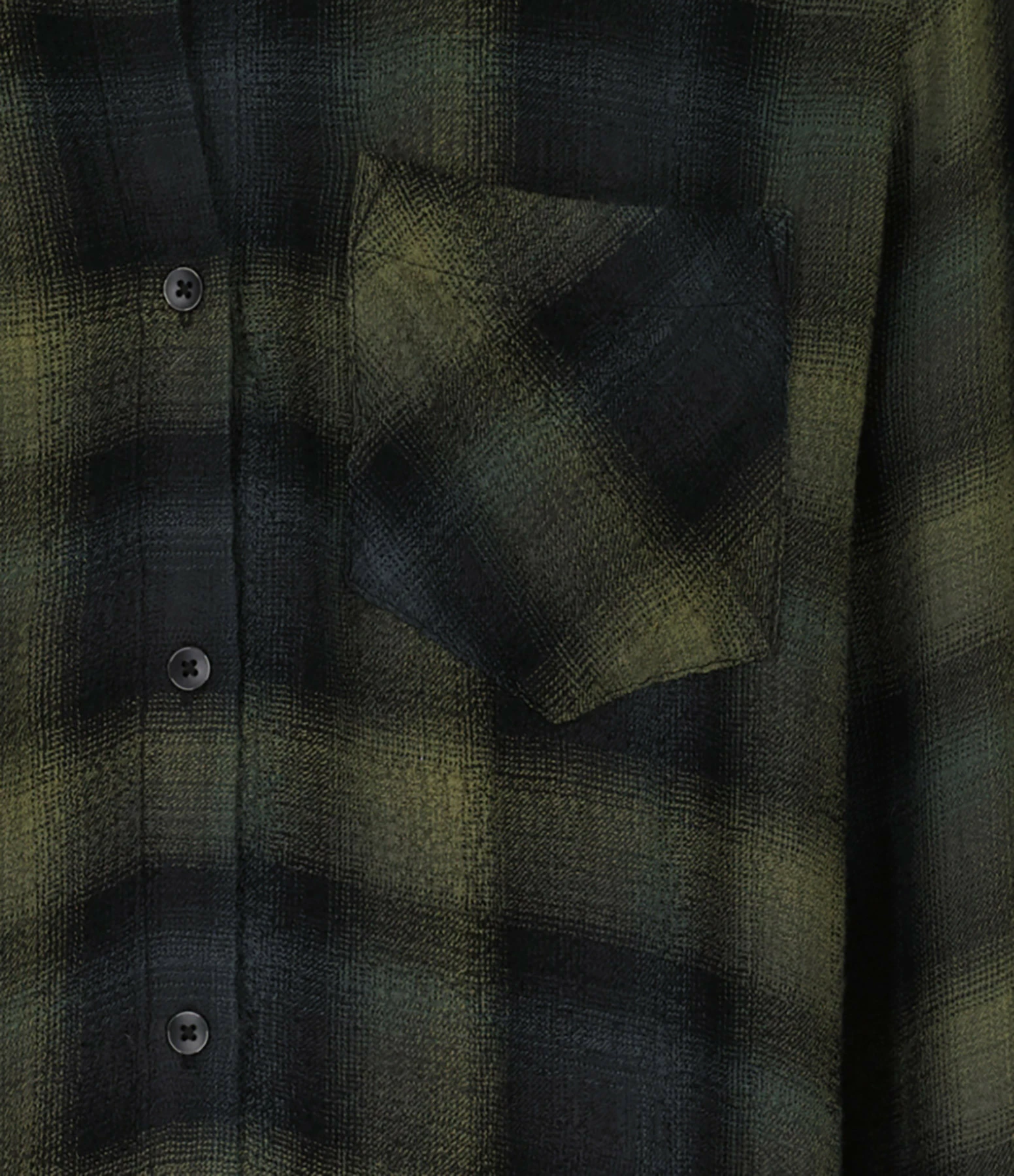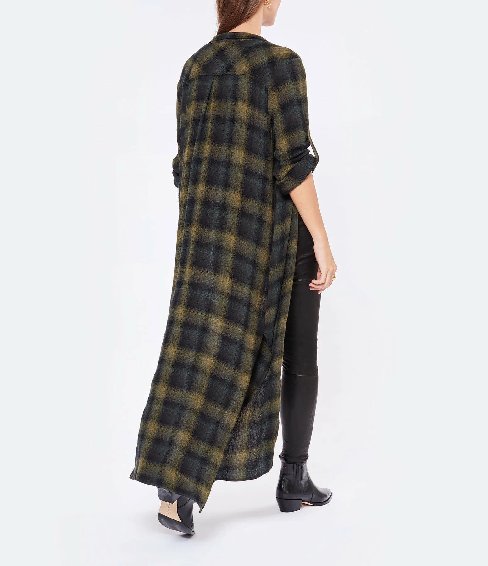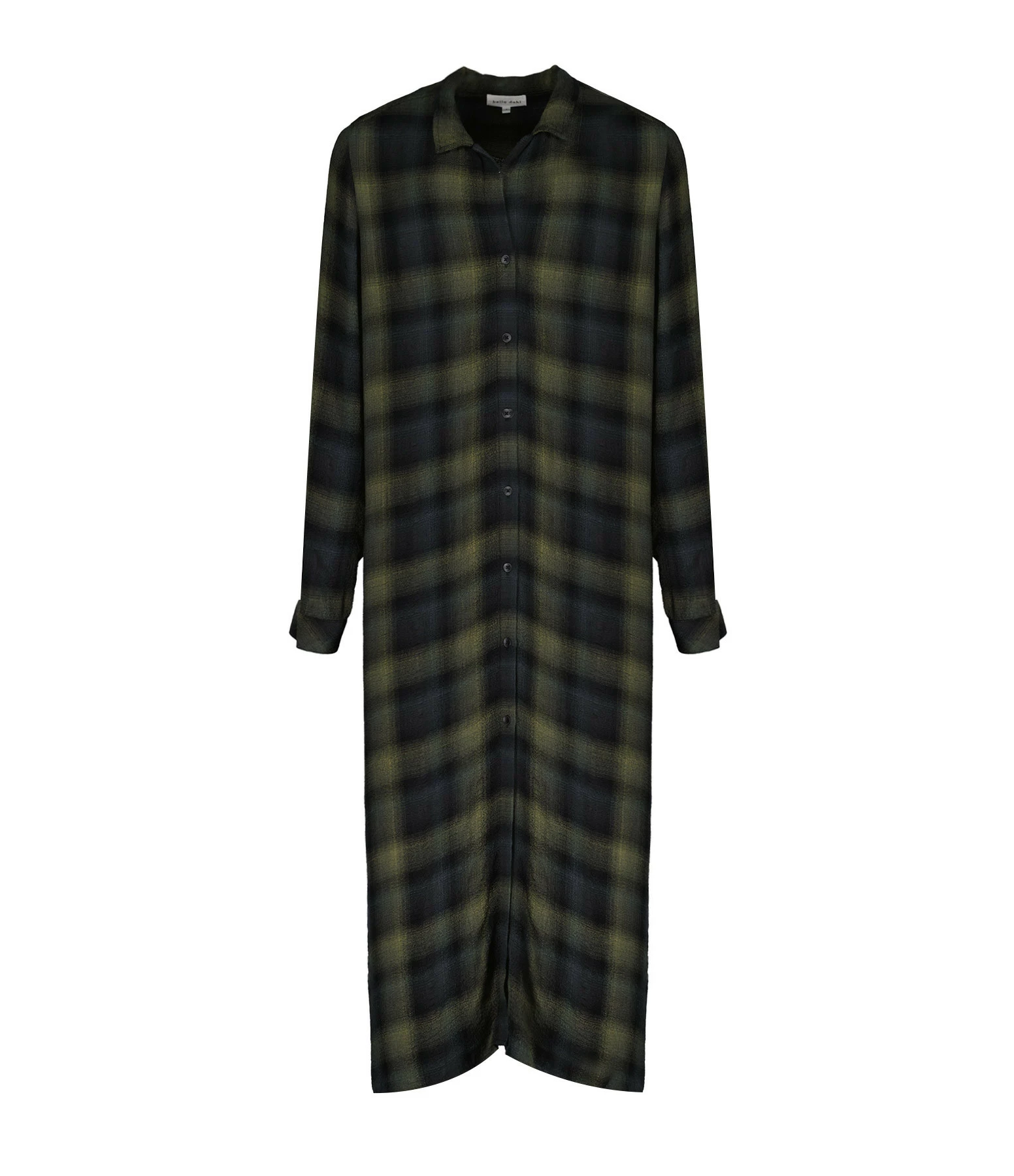 Robe chemise longue à imprimé carreaux dans des tons verts. Col chemisier. Manches longues avec fentes et poignets boutonnés. Possibilité de rabattre la manche grâce à un bouton présent sur l’avant bras. Fermeture boutonnée sur le devant. Petits boutons noirs. Une poche plaquée poitrine. Pli creux dans le dos. Fentes latérales. Coupe droite. Base droite.