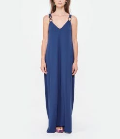 Robe longue bleu nuit fluide. Coupe droite. Base droite. Décolleté en V à l’avant et à l’arrière. Bretelles semi-épaisses avec détails anneaux effet écaille de tortue.