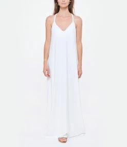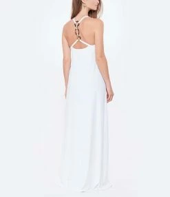 Robe longue blanche fluide. Coupe droite. Base droite. Décolleté en V. Bretelles épaules fines en tissu. Bretelle centrale avec anneaux effet écaille de tortue dans le dos.