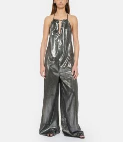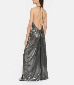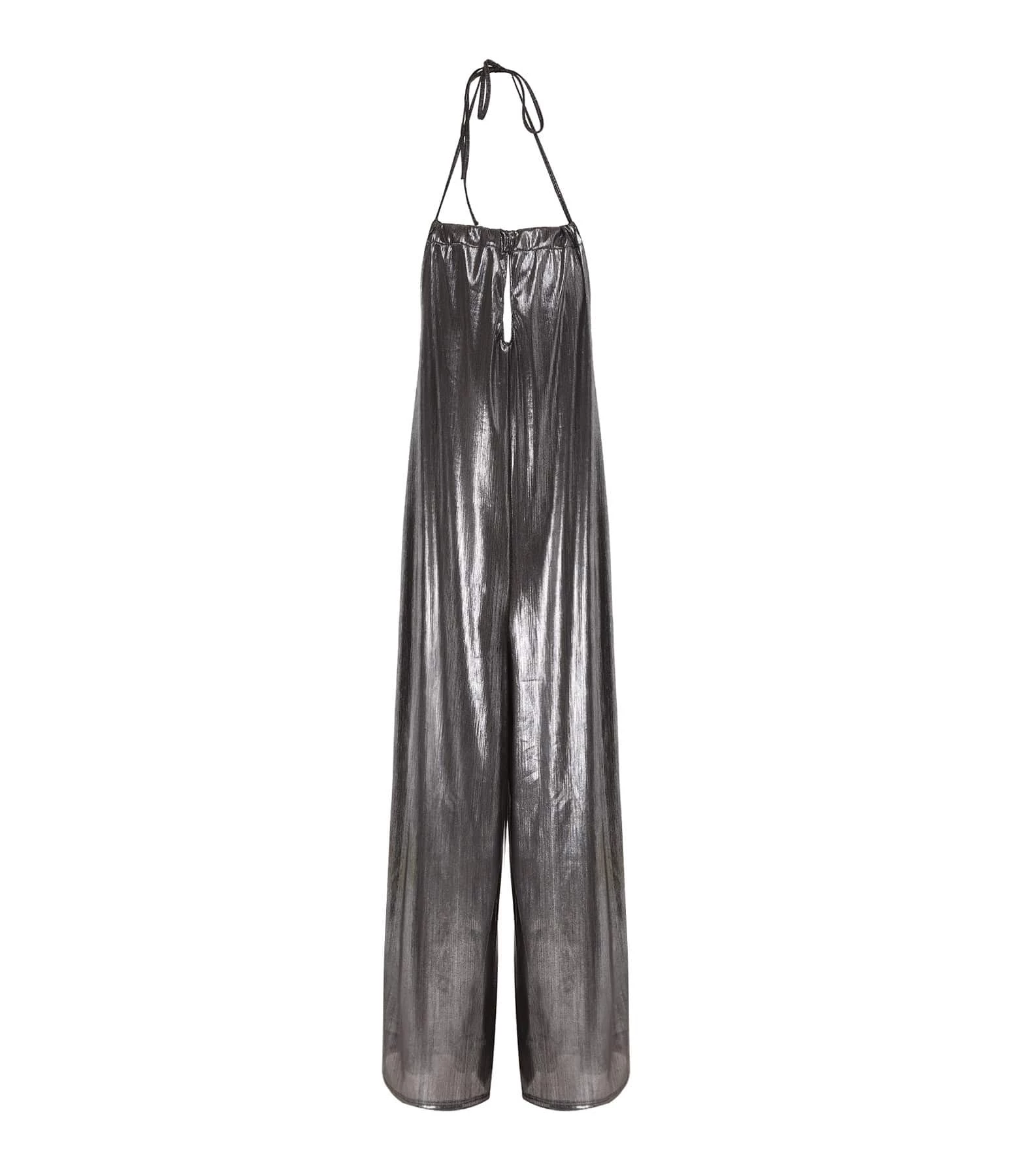 Combinaison longue argentée lamé dos nu. Fermeture par cordon de serrage à nouer dans la nuque et en bas du dos. Ouverture au niveau du décolleté. Coupe évasée. Base droite.
