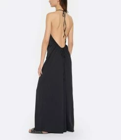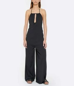 Combinaison longue noire dos nu. Fermeture par cordon de serrage à nouer dans la nuque et en bas du dos. Ouverture au niveau du décolleté. Coupe évasée. Base droite.