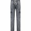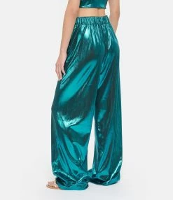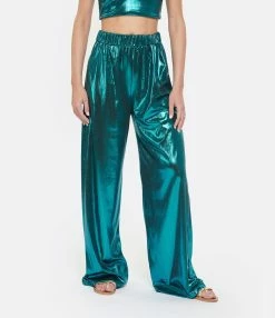 Pantalon lamé turquoise. Taille élastiquée. Deux poches italiennes. Coupe large. Base droite.