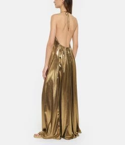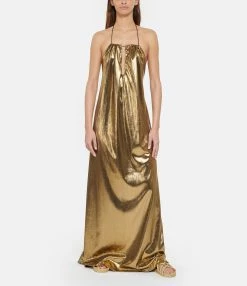 Robe longue doré lamé dos nu. Fermeture par cordon de serrage à nouer dans la nuque et en bas du dos. Coupe évasée. Base droite.