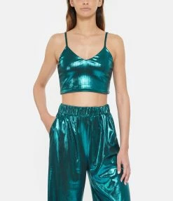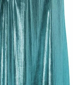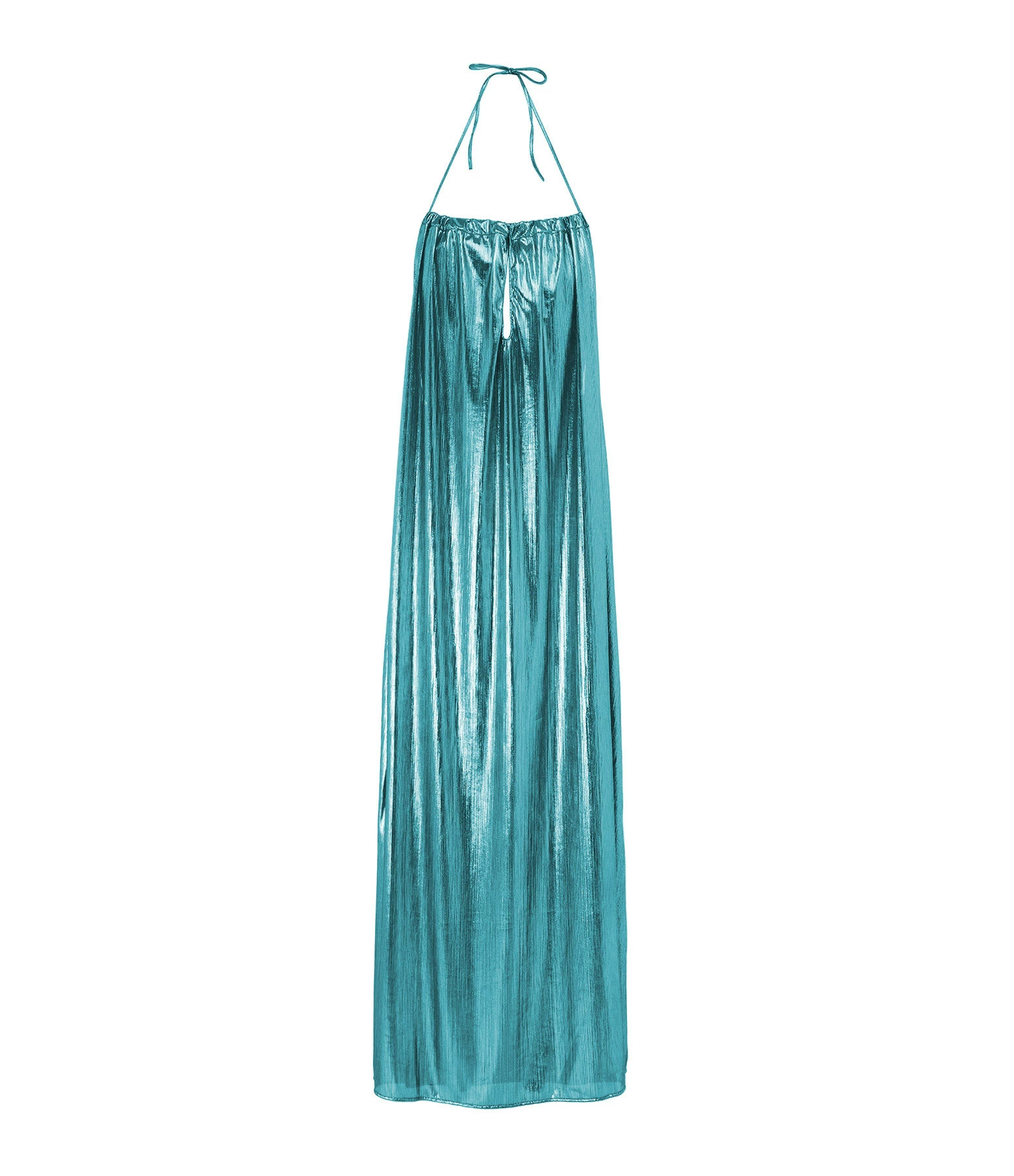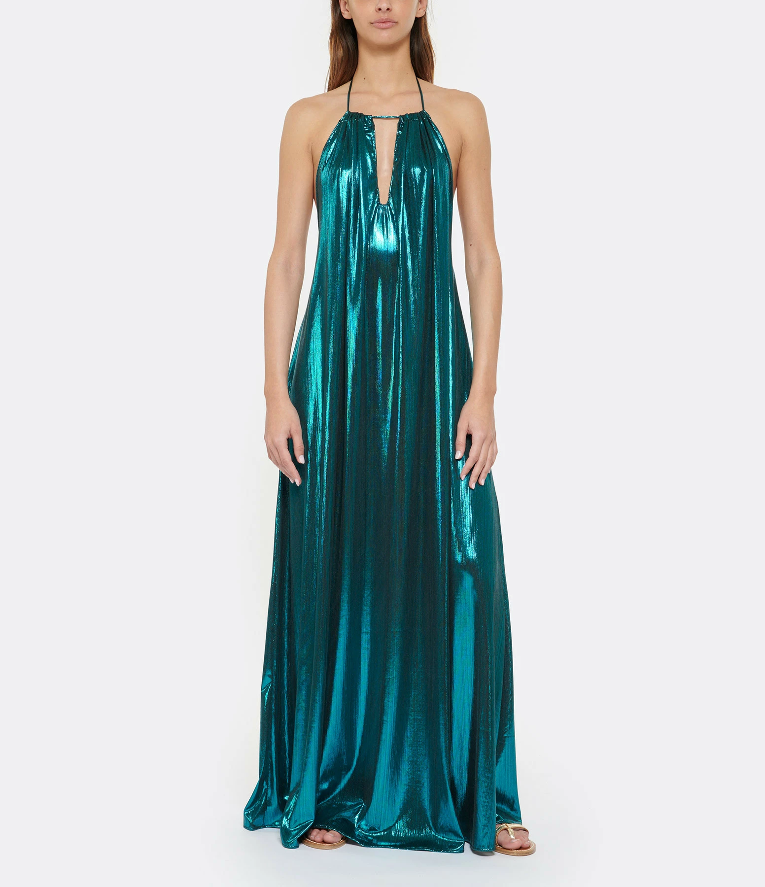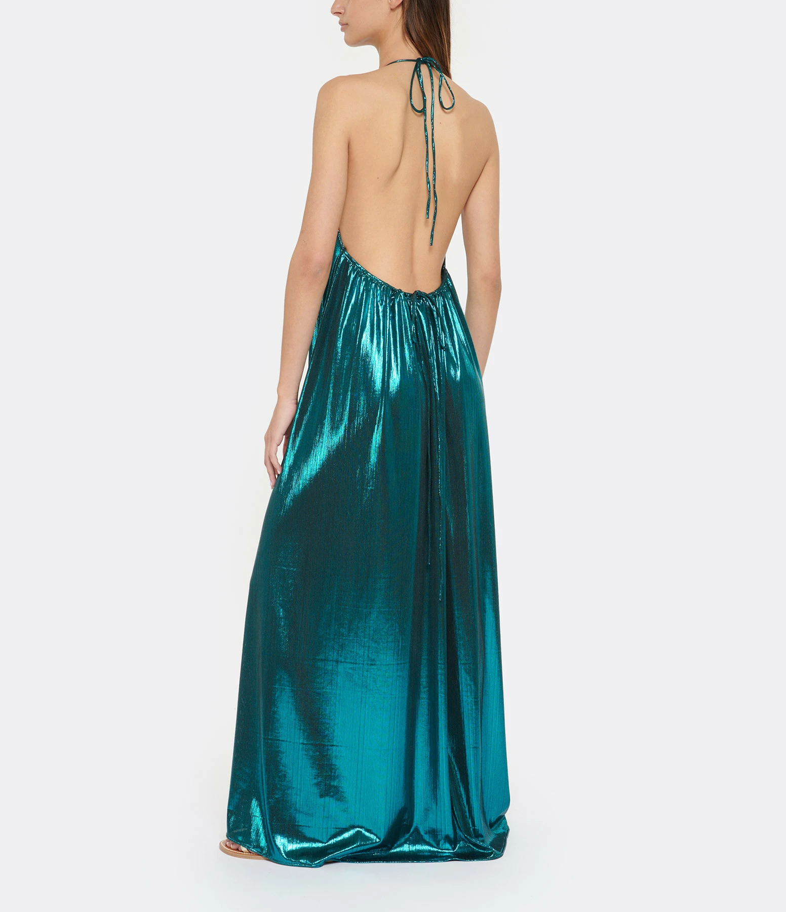 Robe longue bleu lamé dos nu. Fermeture par cordon de serrage à nouer dans la nuque et en bas du dos. Coupe évasée. Base droite.