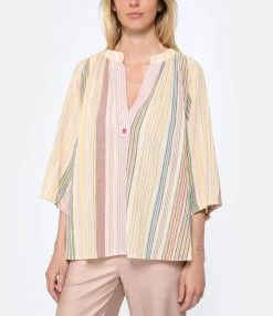 Blouse à rayures multicolores. Col en V. Manches trois-quarts. Coupe droite. Base droite plus longue à l’arrière qu’à l’avant.