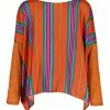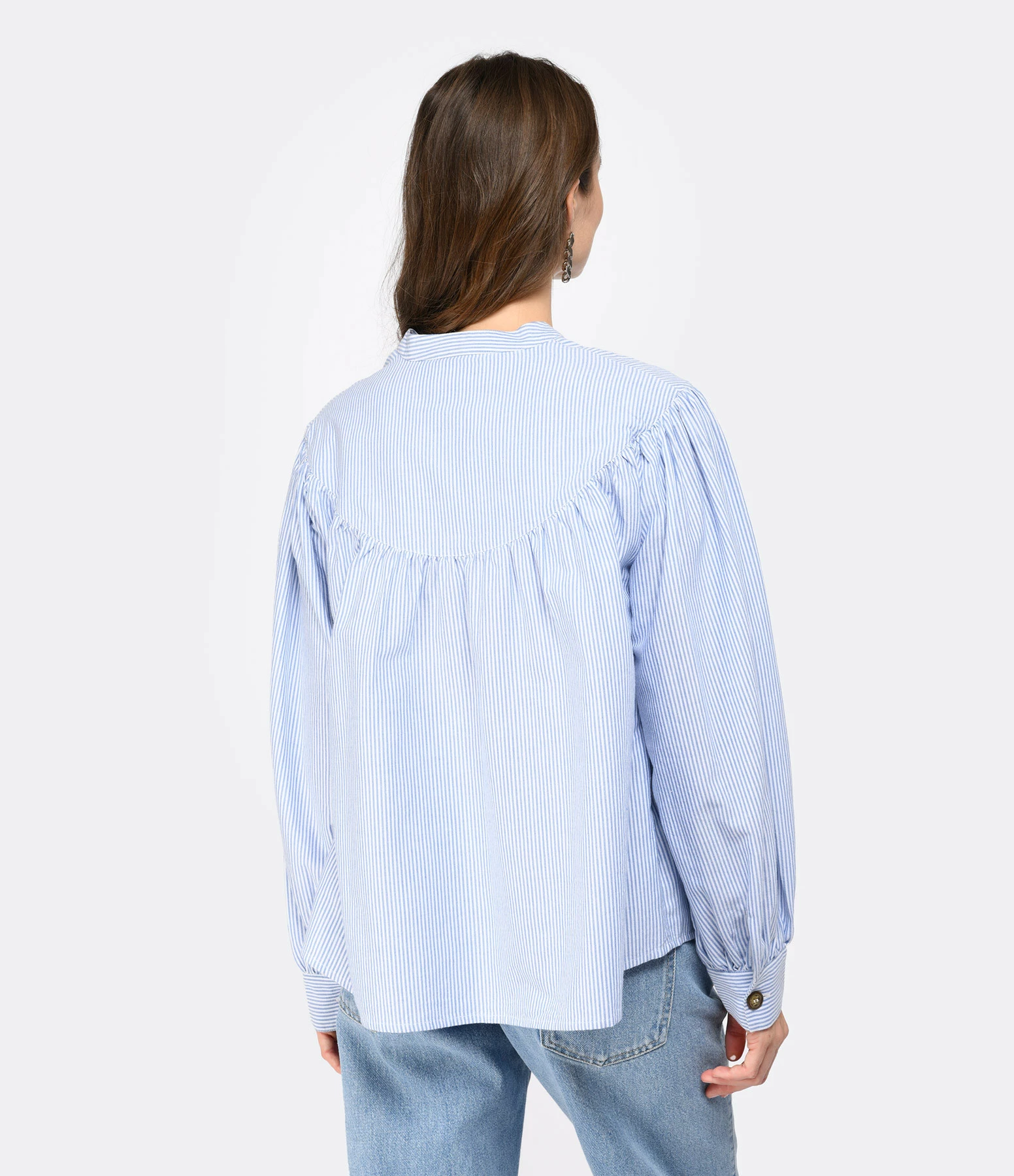 Blouse en coton à rayures bleues et blanches. Col rond. Boutons à l’avant. Manches longues resserrées aux poignets par un bouton. Coupe droite. Base droite.