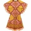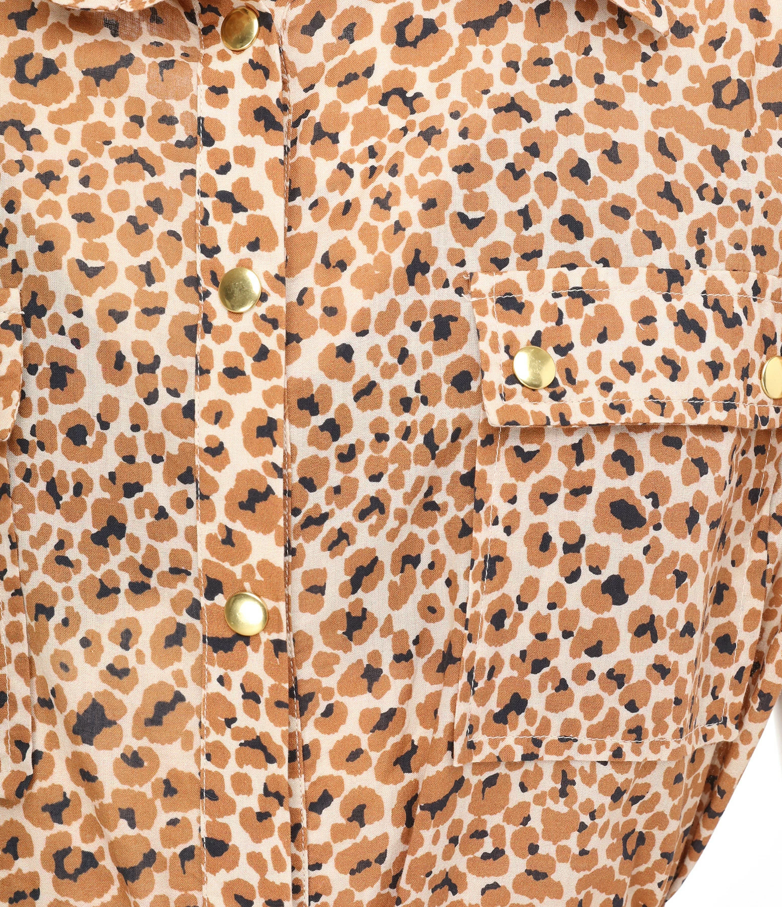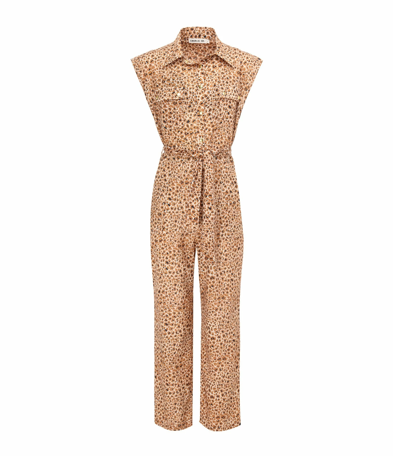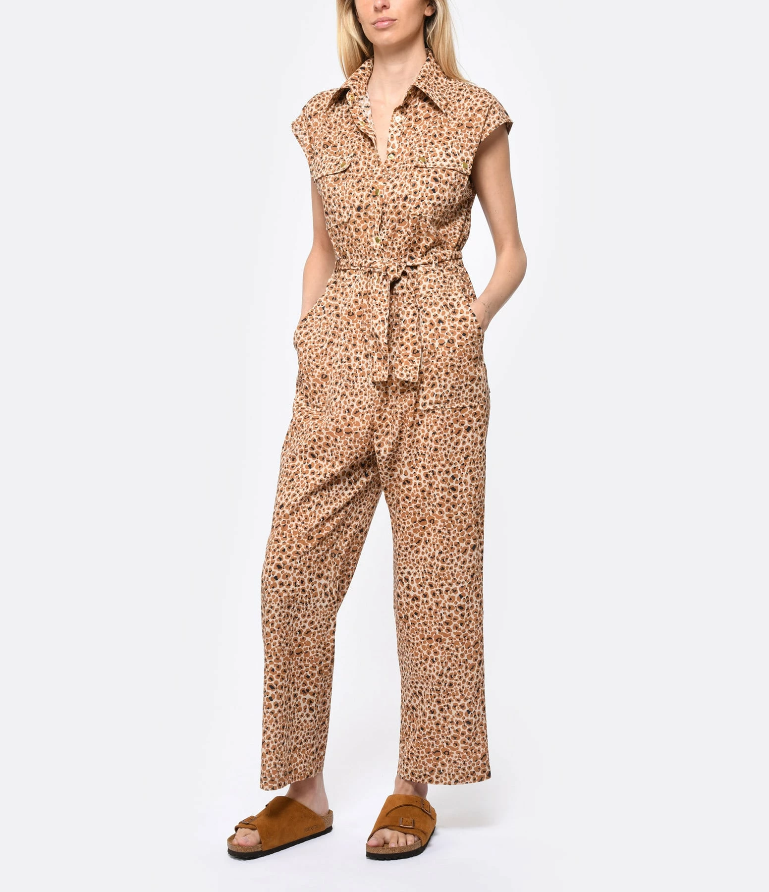 Combinaison longue à imprimé léopard marron. Sans manches. Fermeture par boutons dorés sur le devant. Deux poches à rabats poitrine. Ceinture assortie à nouer à la taille. Col chemisier. Coupe droite. Base droite.
