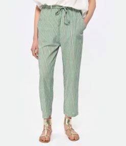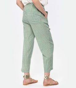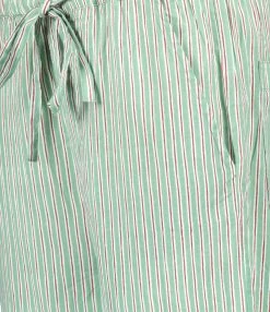 Pantalon en coton à rayures vertes et bordeaux. Taille élastiquée avec cordon de serrage. Quatre poches. Coupe droite. Base droite.