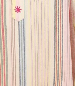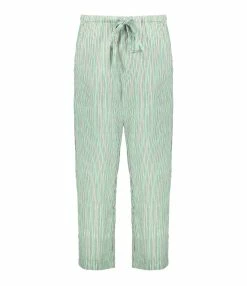 Pantalon en coton à rayures vertes et bordeaux. Taille élastiquée avec cordon de serrage. Quatre poches. Coupe droite. Base droite.