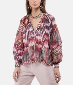 Blouse en coton et soie à imprimé multicolore. Col V avec liens à nouer. Manches longues resserrées aux poignets. Coupe ample. Base droite. Non doublée.