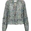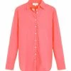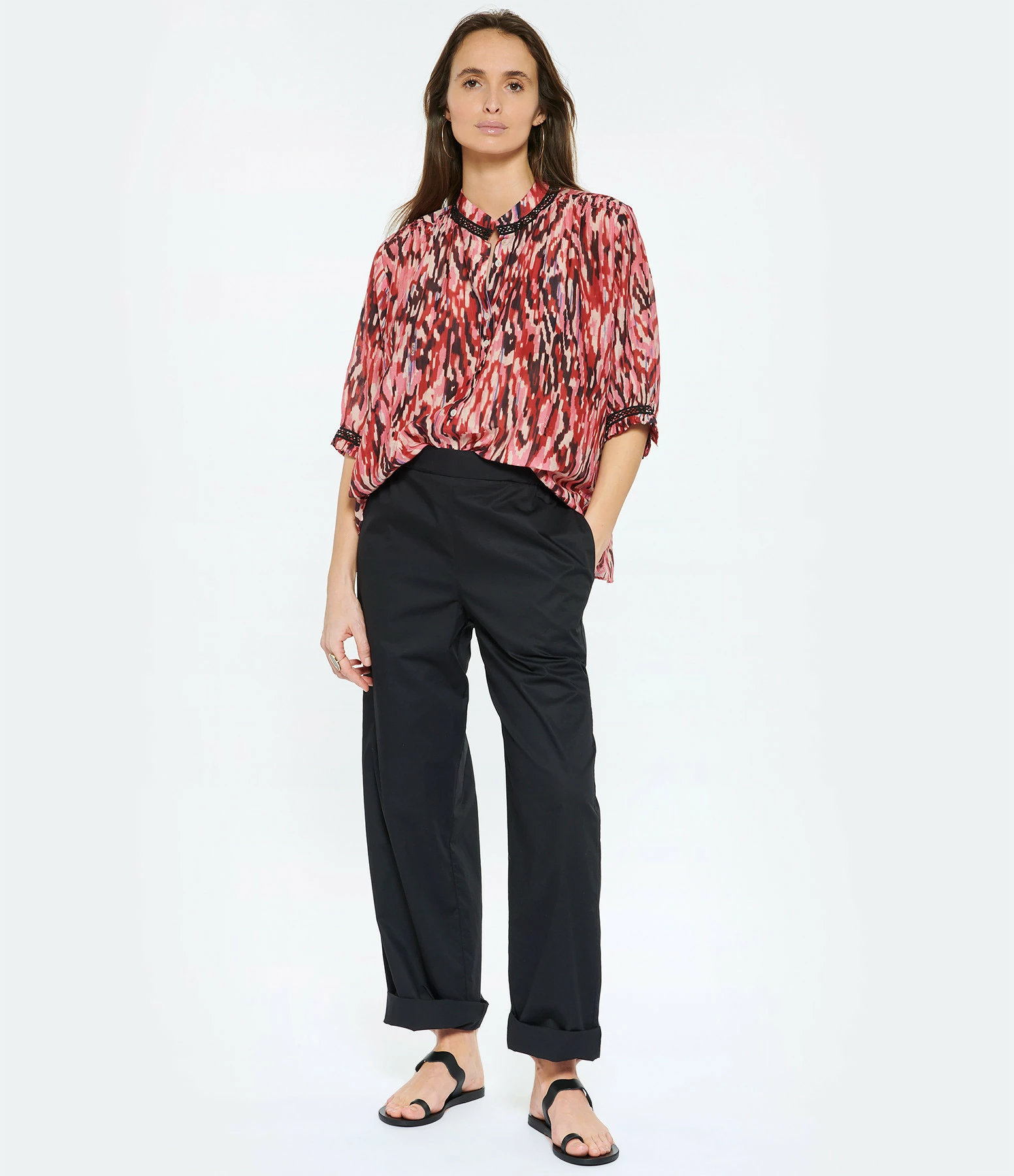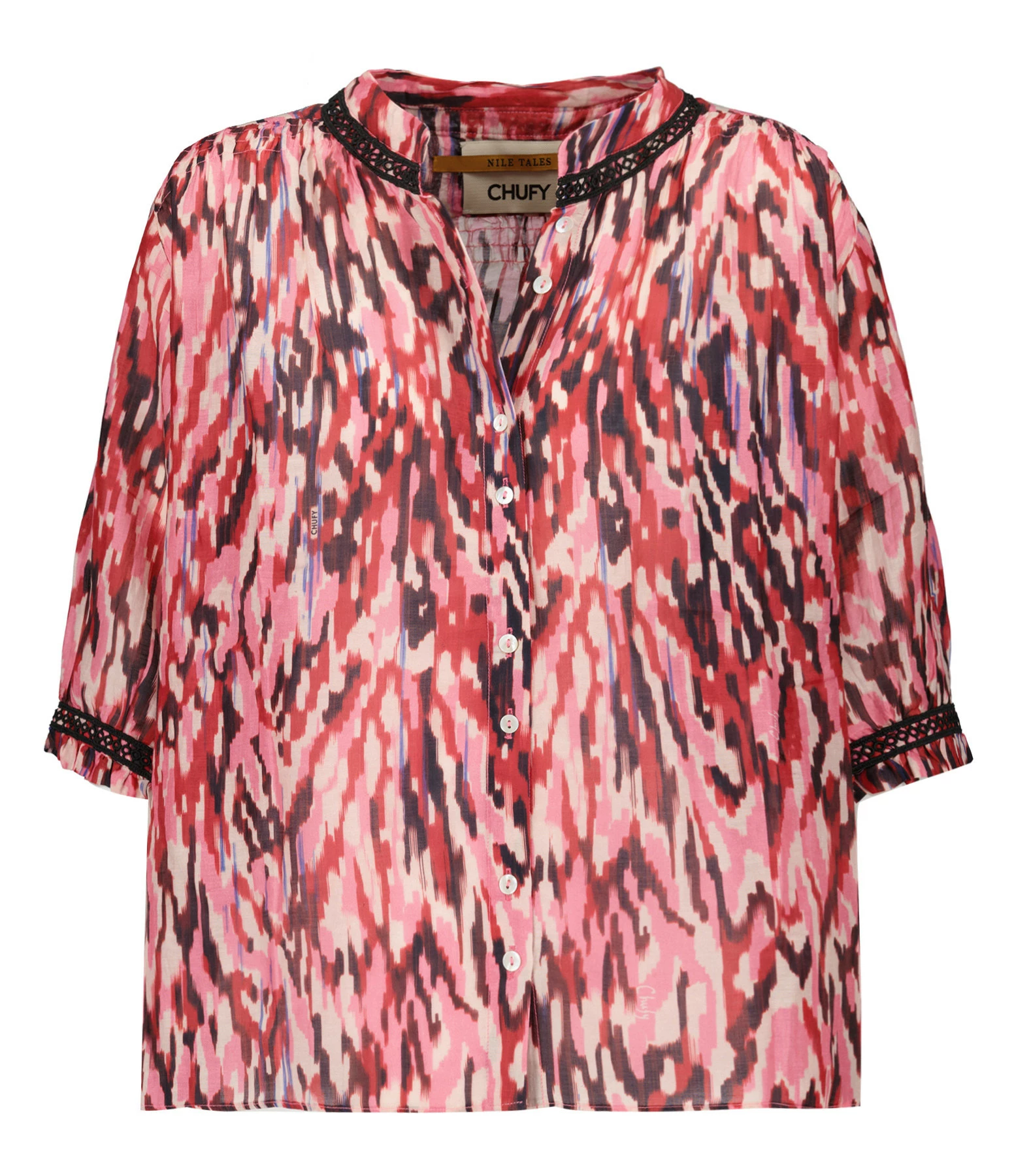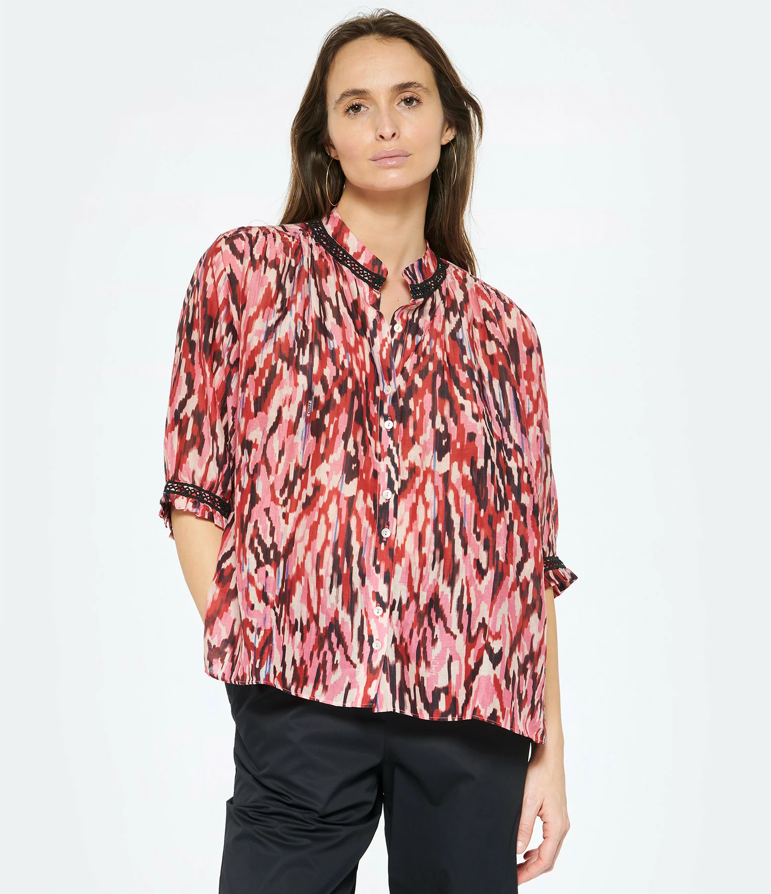 Blouse à imprimé rouge et rose à manches courtes. Fermeture par boutons nacrés sur le devant. Détails en résille noire au niveau du col et des manches. Coupe droite. Base droite.