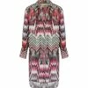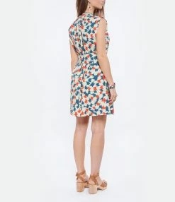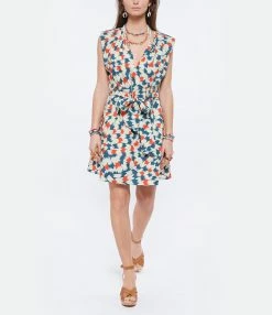 Robe courte en coton à imprimé multicolore. Col V avec liens à nouer. Sans manches, avec épaulettes. Ceinture à nouer amovible. Coupe ample. Base droite. Doublée.
