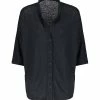 Blouse en lin bleu. Col rond fermé par un bouton. Coupe ample. Base arrondie, plus longue à l’arrière.